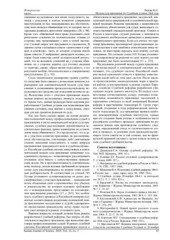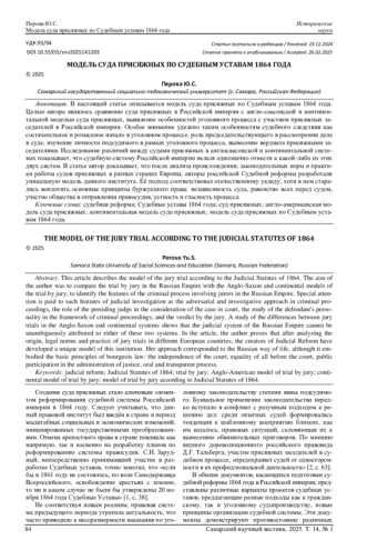 ПЕРОВА Ю. С. МОДЕЛЬ СУДА ПРИСЯЖНЫХ ПО СУДЕБНЫМ УСТАВАМ 1864 ГОДА // САМАРСКИЙ НАУЧНЫЙ ВЕСТНИК. 2025. ТОМ 14, № 1