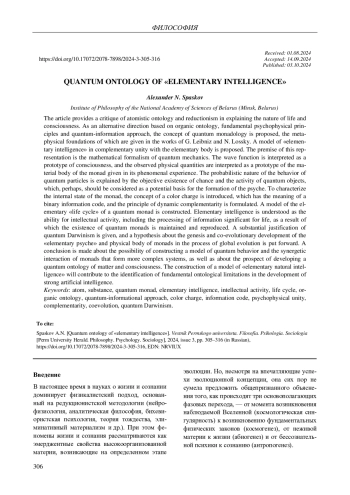 Дается критика атомистической онтологии и редукционизма в объяснении природы жизни и сознания. В качестве альтернативного направления на основе органической онтологии, фундаментальных психофизических принципов и квантово-информационного подхода предлагается концепция квантовой монадологии, метафизические основы которой даются в работах Г. Лейбница и Н. Лосского. Предлагается модель «элементарного интеллекта» в комплементарном единстве с элементарным телом. Предпосылкой такого представления является математический формализм квантовой механики. Волновая функция интерпретируется как прототип сознания, а наблюдаемые физические величины - как прототип материального тела монады, данного в ее феноменальном опыте. Вероятностный характер поведения квантовых частиц объясняется объективным существованием случайностей и активностью квантовых объектов, которую, возможно, следует рассматривать как потенциальную основу формирования психики. Для характеристики внутреннего состояния монады вводится понятие цветового заряда, имеющего смысл двоичного информационного кода, и формулируется принцип динамической комплементарности. Строится модель элементарного «жизненного цикла» квантовой монады. Под элементарным интеллектом понимается способность к интеллектуальной деятельности, включающей в себя процессы переработки значимой для «жизнедеятельности» информации, в результате которой поддерживается и воспроизводится собственное существование квантовых монад. Дается субстанциальное обоснование квантового дарвинизма и выдвигается гипотеза генезиса и коэволюционного развития «элементарной психики» и физического тела монад в процессе глобальной эволюции. Делается вывод о возможности построения модели квантового поведения и синергетического взаимодействия монад, образующих более сложные системы, а также о перспективе разработки квантовой онтологии материи и сознания. Построение модели «элементарного естественного интеллекта» будет способствовать выявлению принципиальных онтологических ограничений при разработке сильного искусственного интеллекта.