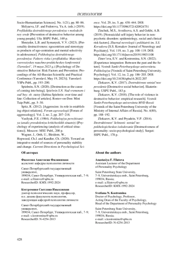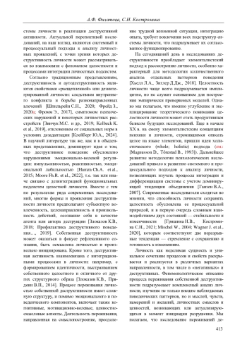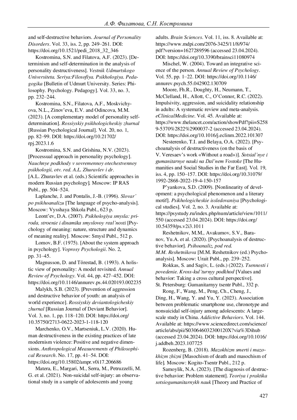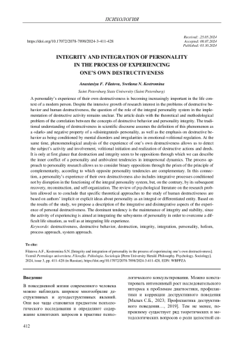 ФИЛАТОВА А. Ф., КОСТРОМИНА С. Н. ЦЕЛОСТНОСТЬ И ИНТЕГРАЦИЯ ЛИЧНОСТИ В ПРОЦЕССЕ ПЕРЕЖИВАНИЯ СОБСТВЕННОЙ ДЕСТРУКТИВНОСТИ // ВЕСТНИК ПЕРМСКОГО УНИВЕРСИТЕТА. ФИЛОСОФИЯ. ПСИХОЛОГИЯ. СОЦИОЛОГИЯ. 2024. № 3
