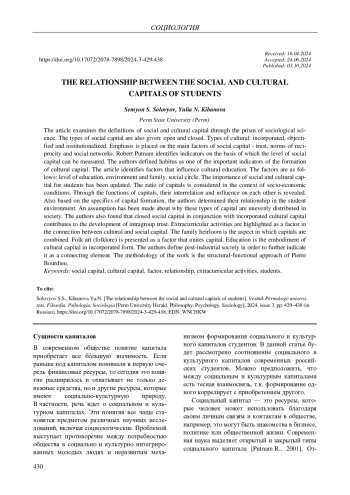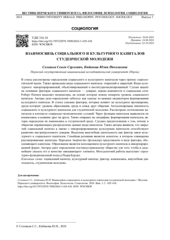 СОЛОВЬЕВ С. С., КИБАНОВА Ю. Н. ВЗАИМОСВЯЗЬ СОЦИАЛЬНОГО И КУЛЬТУРНОГО КАПИТАЛОВ СТУДЕНЧЕСКОЙ МОЛОДЕЖИ // ВЕСТНИК ПЕРМСКОГО УНИВЕРСИТЕТА. ФИЛОСОФИЯ. ПСИХОЛОГИЯ. СОЦИОЛОГИЯ. 2024. № 3