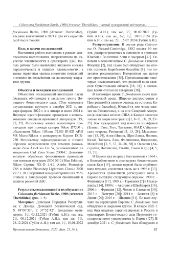 В ходе обследований, проведенных в оранжереях Донецкого ботанического сада, впервые для юга европейской части России был выявлен Coleosoma floridanum Banks, 1900 (Araneae: Theridiidae) – чужеродный пантропический вид пауков неотропического происхождения. Основным способом расселения вида является случайный завоз вместе с живыми растениями или другими грузами. В Европе вид является облигатным синантропом, связанным c теплицами и оранжереями ботанических садов. В оранжереях Донецкого ботанического сада вид регистрировали на абаксиальной стороне листьев, стволах растений и под цветочными горшками. В качестве объектов питания были отмечены растительноядные клещи Panonychus citri и Tetranychus urticae, личинки мучнистого червеца Planococcus ficus, имаго белокрылки Trialeurodes vaporariorum, различные виды трипсов (Tripidae) и сциарид (Sciaridae). В настоящее время C. floridanum рассматривается нами как эффективный агент биологической борьбы с вредителями в закрытом грунте Донецкого ботанического сада.