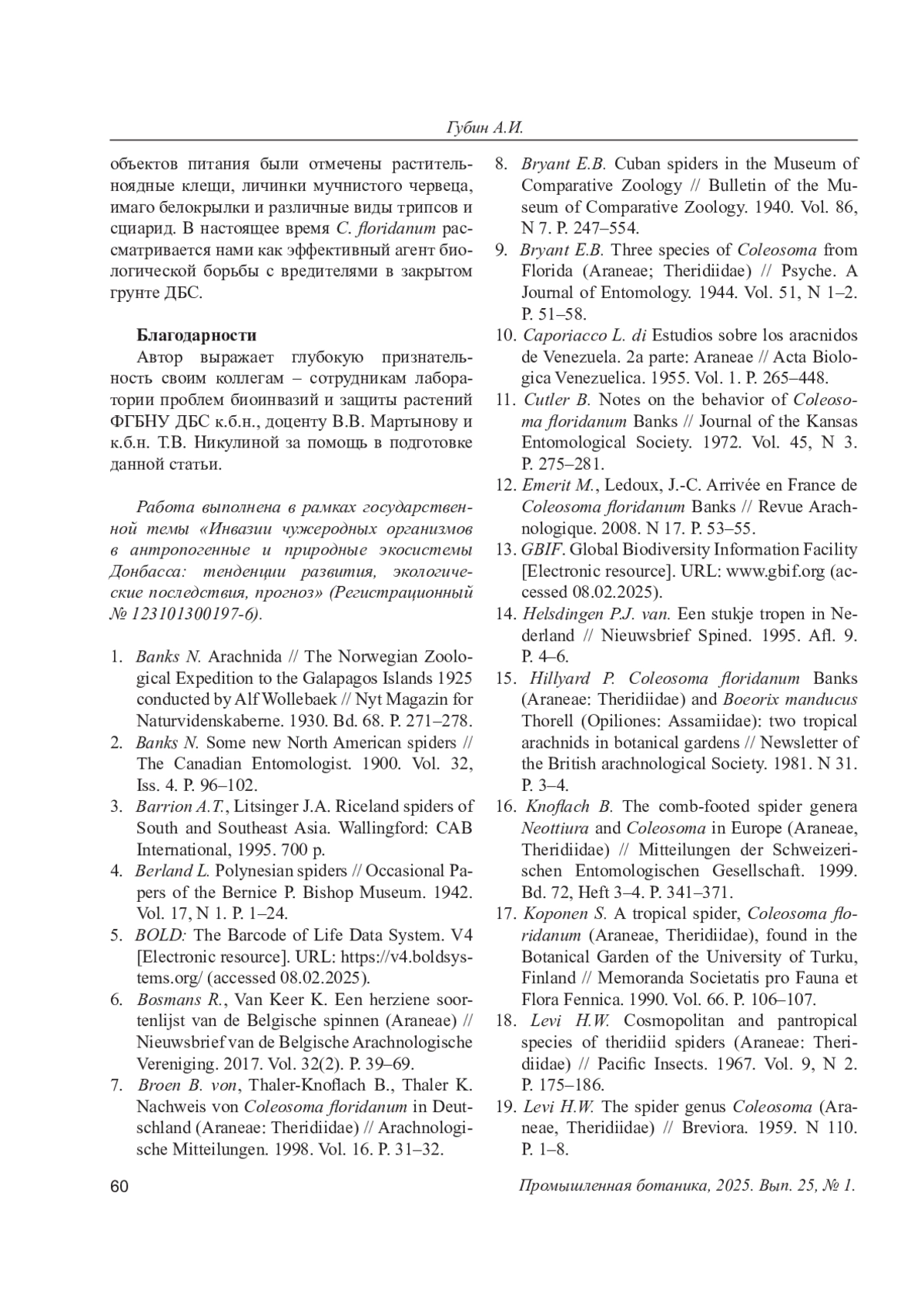17. Koponen S. A tropical spider, Coleosoma floridanum (Araneae, Theridiidae), found in the Botanical Garden of the University of Turku, Finland // Memoranda Societatis pro Fauna et Flora Fennica. 1990. Vol. 66. P. 106-107.