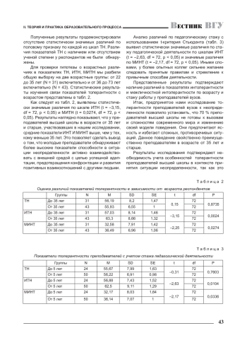 Результаты изучения межличностной интолерантности к неопределенности (МИНТ) показали, что 70 % опрошенных преподавателей в той или иной степени испытывают дискомфорт в отношениях с другими людьми в ситуации неопределенности, не принимают во внимание мнение другого человека, что указывает на нестабильность педагогов в отношениях с коллегами, студентами и другими участниками образовательного процесса. Следующим этапом изучения толерантности преподавателей был анализ связи этого личностного качества с возрастом, стажем педагогической деятельности, половой принадлежностью и наличием или отсутствием ученой степени у преподавателей.