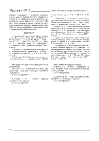 7. Подымова Л. С. Самоопределение педагогов в ситуации неопределенности / Л. С. Подымова // Современные векторы развития образования: актуальные проблемы и перспективные решения: сборник научных трудов XI Международной научно-практической конференции: в 2 ч. Москва, 25 января 2019 года. - Москва: Моск. пед. гос. ун-т, 2019. -Часть I. - С. 661-663. EDN: ZTMTJR