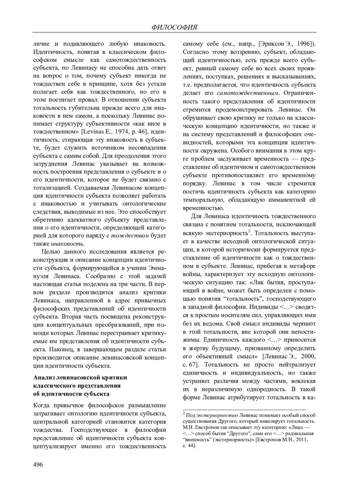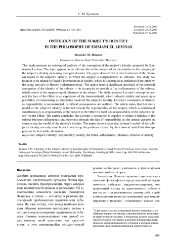 Статья: ОНТОЛОГИЯ ИДЕНТИЧНОСТИ СУБЪЕКТА В ФИЛОСОФИИ ЭММАНУЭЛЯ ЛЕВИНАСА (2024)