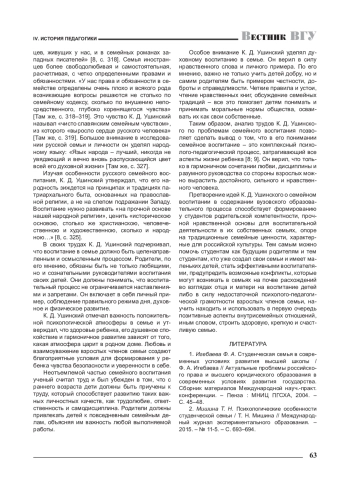 Претворение идей К. Д. Ушинского о семейном воспитании в содержании вузовского образовательного процесса способствует формированию у студентов родительской компетентности, прочной нравственной основы для воспитательной деятельности в их собственных семьях, опоре на традиционные семейные ценности, характерные для российской культуры. Тем самым можно помочь студентам как будущим родителям и тем студентам, кто уже создал свои семьи и имеет маленьких детей, стать эффективными воспитателями, предупредить возможные конфликты, которые могут возникать в семьях на почве расхождений во взглядах отца и матери на воспитание детей либо в силу недостаточной психолого-педагогической грамотности взрослых членов семьи, научить находить и использовать в первую очередь позитивные аспекты внутрисемейных отношений, иным словом, строить здоровую, крепкую и счастливую семью.