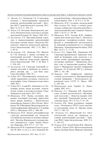 14. Заугольнова Л.Б., Денисова Л.Б., Никитина С.В. Подходы к оценке состояния ценопопуляций растений // Бюллетень Московского общества испытателей природы. Отдел биологический. 1993. Т. 98, Вып. 5. С. 100-109.