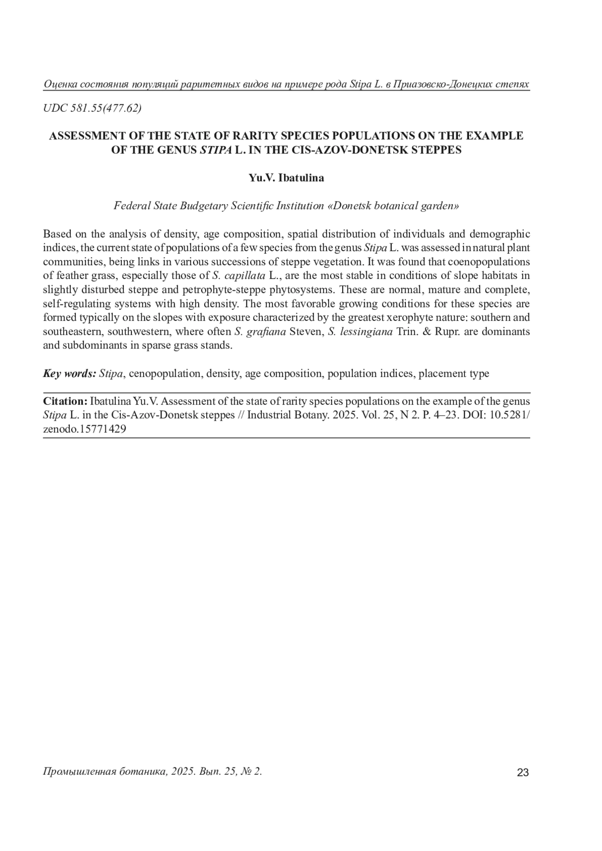 21. Ибатулина Ю.В. Состояние ценопопуляций Stipa ucrainica P.A. Smirn. в степных растительных сообществах в бассейне реки Миус // Экологический Вестник Северного Кавказа. 2024. Т. 20, N 3. С. 94-99.