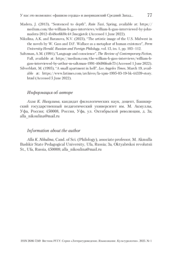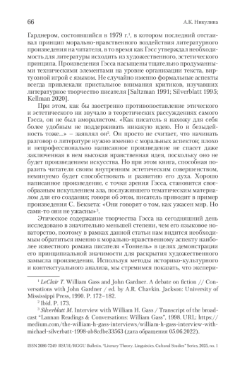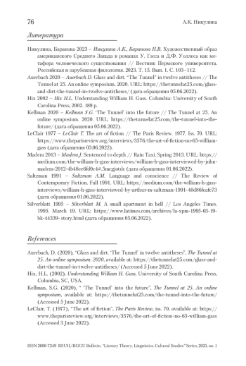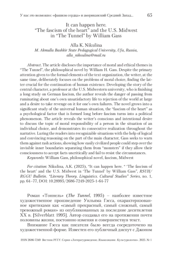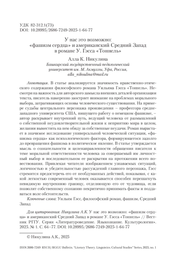 НИКУЛИНА А. К. У НАС ЭТО ВОЗМОЖНО: «ФАШИЗМ СЕРДЦА» И АМЕРИКАНСКИЙ СРЕДНИЙ ЗАПАД В РОМАНЕ У. ГЭССА «ТОННЕЛЬ» // ВЕСТНИК РГГУ. СЕРИЯ «ЛИТЕРАТУРОВЕДЕНИЕ. ЯЗЫКОЗНАНИЕ. КУЛЬТУРОЛОГИЯ». 2025. № 1