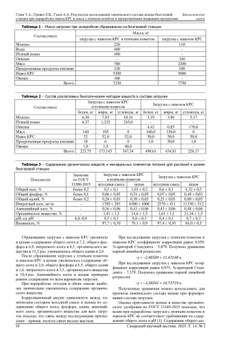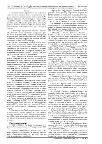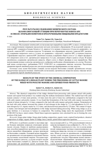 Статья: РЕЗУЛЬТАТЫ ИССЛЕДОВАНИЯ ХИМИЧЕСКОГО СОСТАВА ШЛАМА БИОГАЗОВОЙ СТАНЦИИ ПРИ ПЕРЕРАБОТКЕ НАВОЗА КРС В СМЕСИ С ПТИЧЬИМ ПОМЁТОМ И ПРОСРОЧЕННЫМИ ПИЩЕВЫМИ ПРОДУКТАМИ (2025)