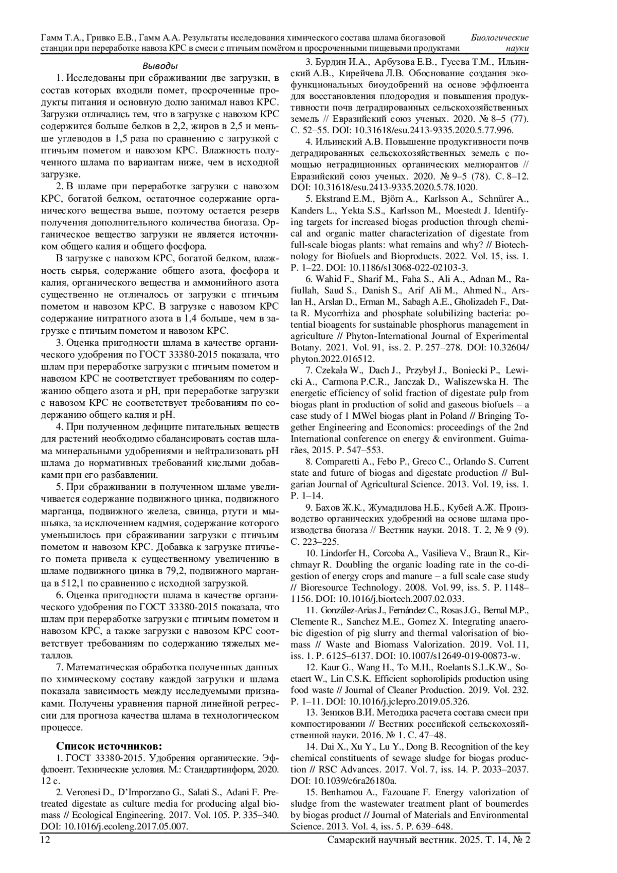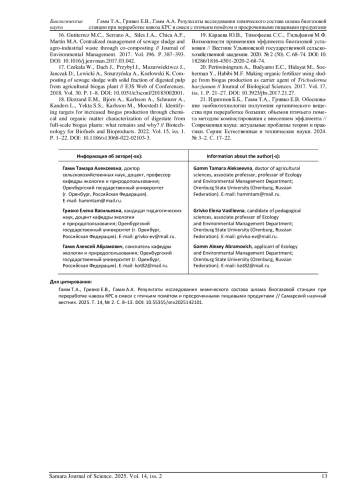ГАММ Т. А., ГРИВКО Е. В., ГАММ А. А. РЕЗУЛЬТАТЫ ИССЛЕДОВАНИЯ ХИМИЧЕСКОГО СОСТАВА ШЛАМА БИОГАЗОВОЙ СТАНЦИИ ПРИ ПЕРЕРАБОТКЕ НАВОЗА КРС В СМЕСИ С ПТИЧЬИМ ПОМЁТОМ И ПРОСРОЧЕННЫМИ ПИЩЕВЫМИ ПРОДУКТАМИ // САМАРСКИЙ НАУЧНЫЙ ВЕСТНИК. 2025. ТОМ 14, № 2