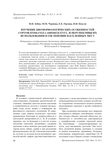 В статье рассматривается сортимент Hydrangea arborescens L. и перспективы его использования в озеленении населенных мест как перспективное решение улучшения экологической обстановки и повышения качества жизни в условиях урбанизации. Проведен биометрический анализ сортов, дана оценка их экологической и эстетической ценности. Выделены сорта, пригодные для одиночных, групповых и рядовых посадок. Низкорослые сорта с компактной формой куста могут быть рекомендованы для выращивания по контейнерной технологии. Полученные результаты позволяют рекомендовать для контейнерного выращивания сорта Bella Ragazza Mauvette и Candybelle Bubblegum, для одиночных посадок - сорт Bounty, для рядовых и групповых посадок - сорта White Ball, Pink Pincushion и Radiata.