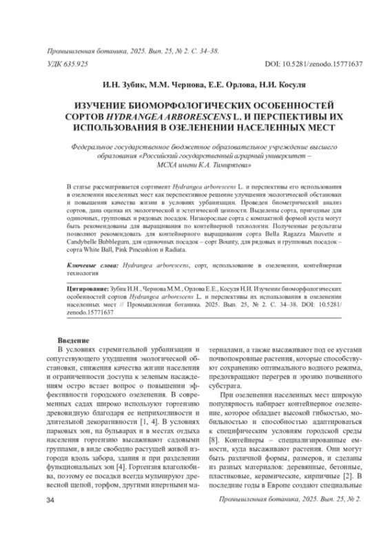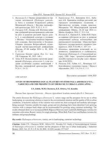 4. Зубик И.Н. Использование гортензии древовидной (Нydrangea arborescens L.) для создания устойчивых садовых композиций // Вестник ландшафтной архитектуры. 2020. N 24. С. 18-21.