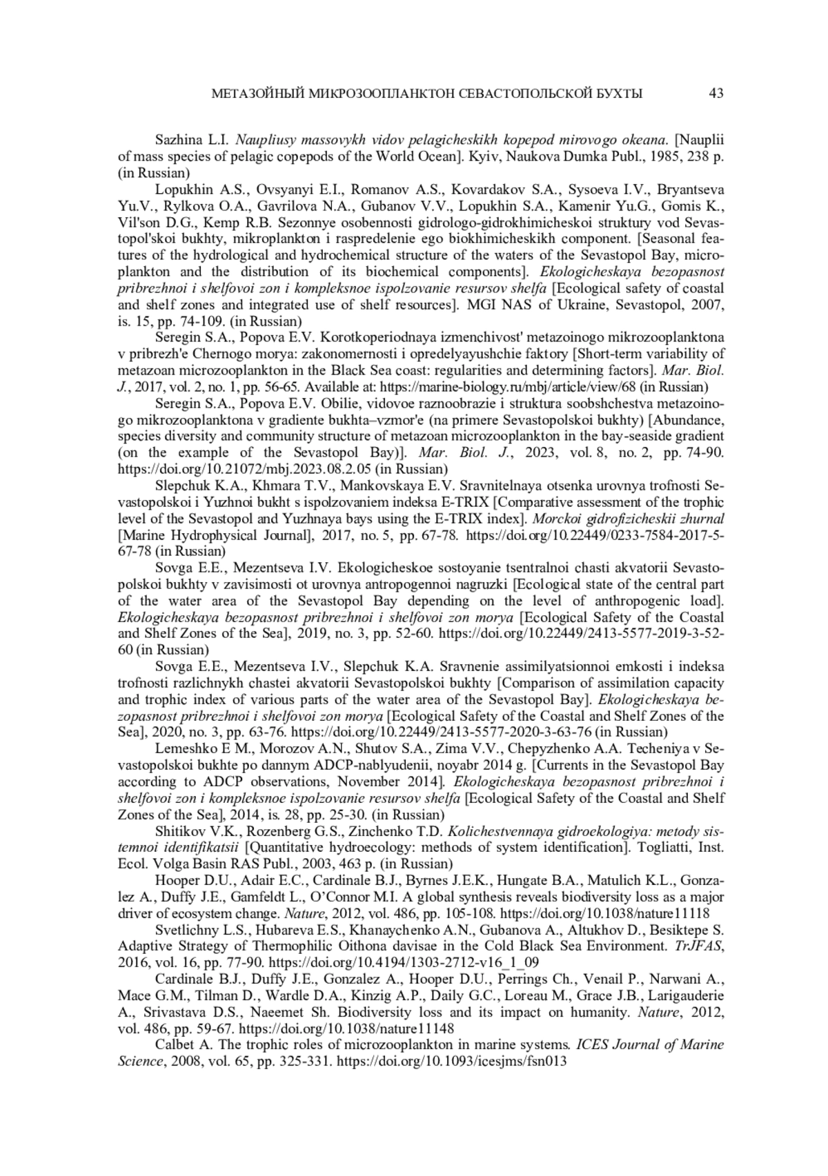 18. Серегин С. А., Попова Е. В. Обилие, видовое разнообразие и структура сообщества метазойного микрозоопланктона в градиенте бухта-взморье (на примере Севастопольской бухты) // Морской биологический журнал. 2023. Т. 8, № 2. С. 74-90. DOI: 10.21072/mbj.2023.08.2.05