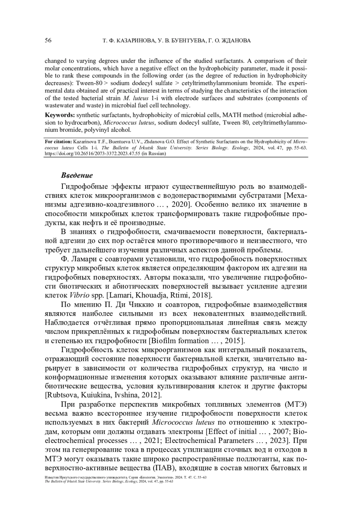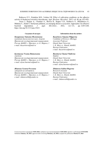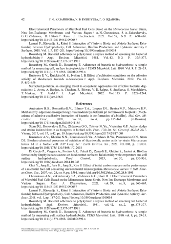 10. Rubtsova E. V., Kuiukina M. S., Ivshina I. B. Effect of cultivation conditions on the adhesive activity of rhodococci towards n-hexadecane // Appl. Biochem. Microbiol. 2012. Vol. 48. P. 452-459.