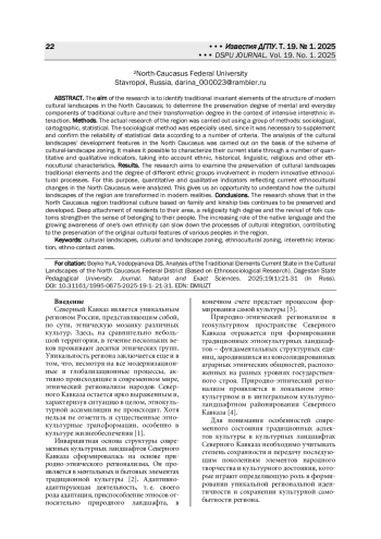 Цели - выявление традиционных инвариантных элементов структуры современных культурных ландшафтов Северного Кавказа; определение степени сохранности ментальных и бытовых компонентов традиционной культуры и степени их трансформации в условиях интенсивного межэтнического взаимодействия. Методы. Актуальные исследования региона осуществлялись с помощью группы методов: социологических, картографических, статистических. В особенности применялся социологический метод, поскольку по ряду критериев необходимо было дополнить и подтвердить достоверность статистических данных. Анализ особенностей развития культурных ландшафтов Северного Кавказа проводился на основе схемы культурно-ландшафтного районирования. Он позволяет охарактеризовать их современное состояние через ряд количественных и качественных показателей с учетом этнических, исторических, лингвистических, конфессиональных и других этнокультурных характеристик. Результаты. Исследование направлено на изучение сохранности традиционных элементов культурных ландшафтов и степени вовлеченности разных этнических групп в современные инновационные этнокультурные процессы. С этой целью были проанализированы количественные и качественные показатели, отражающие текущие этнокультурные изменения на Северном Кавказе, позволяющие понять, как трансформируются культурные ландшафты региона в современных реалиях. Выводы. Исследование показывает, что в Северо-Кавказском регионе продолжает сохраняться и развиваться традиционная культура, базирующаяся на семейных и родственных связях. Глубокая привязанность жителей к своей местности, высокая степень религиозности и возрождение народных обычаев укрепляют чувство принадлежности к своему народу. Повышение роли родного языка и рост осознания собственной этничности способны замедлить процессы культурной интеграции, способствуя сохранению самобытных культурных черт различных народов региона.