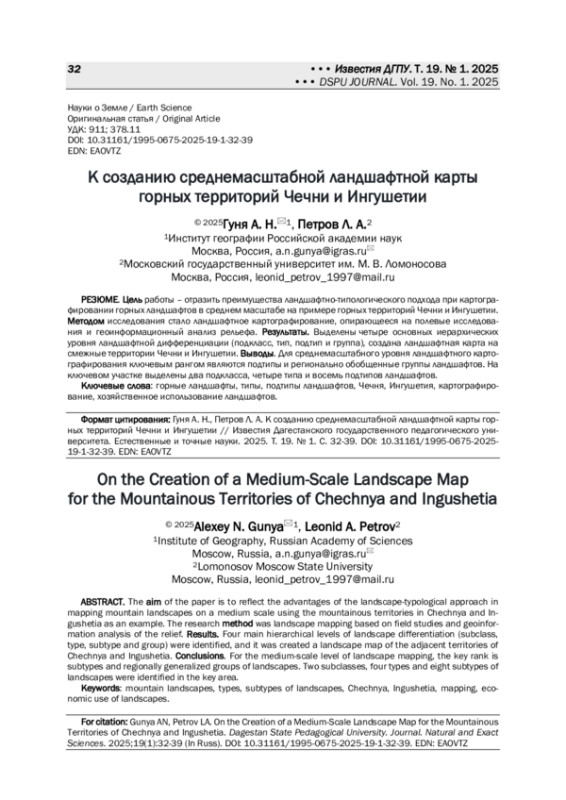 ГУНЯ А. Н., ПЕТРОВ Л. А. К СОЗДАНИЮ СРЕДНЕМАСШТАБНОЙ ЛАНДШАФТНОЙ КАРТЫ ГОРНЫХ ТЕРРИТОРИЙ ЧЕЧНИ И ИНГУШЕТИИ // ИЗВЕСТИЯ ДАГЕСТАНСКОГО ГОСУДАРСТВЕННОГО ПЕДАГОГИЧЕСКОГО УНИВЕРСИТЕТА. ЕСТЕСТВЕННЫЕ И ТОЧНЫЕ НАУКИ. 2025. № 1, ТОМ 19