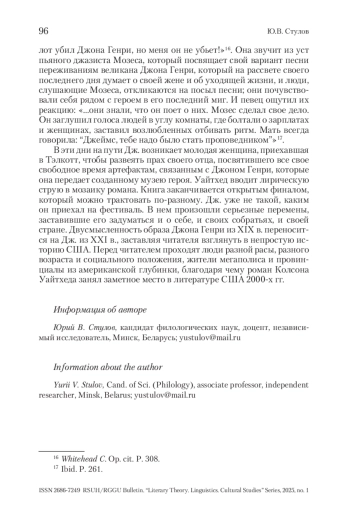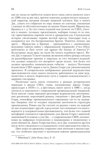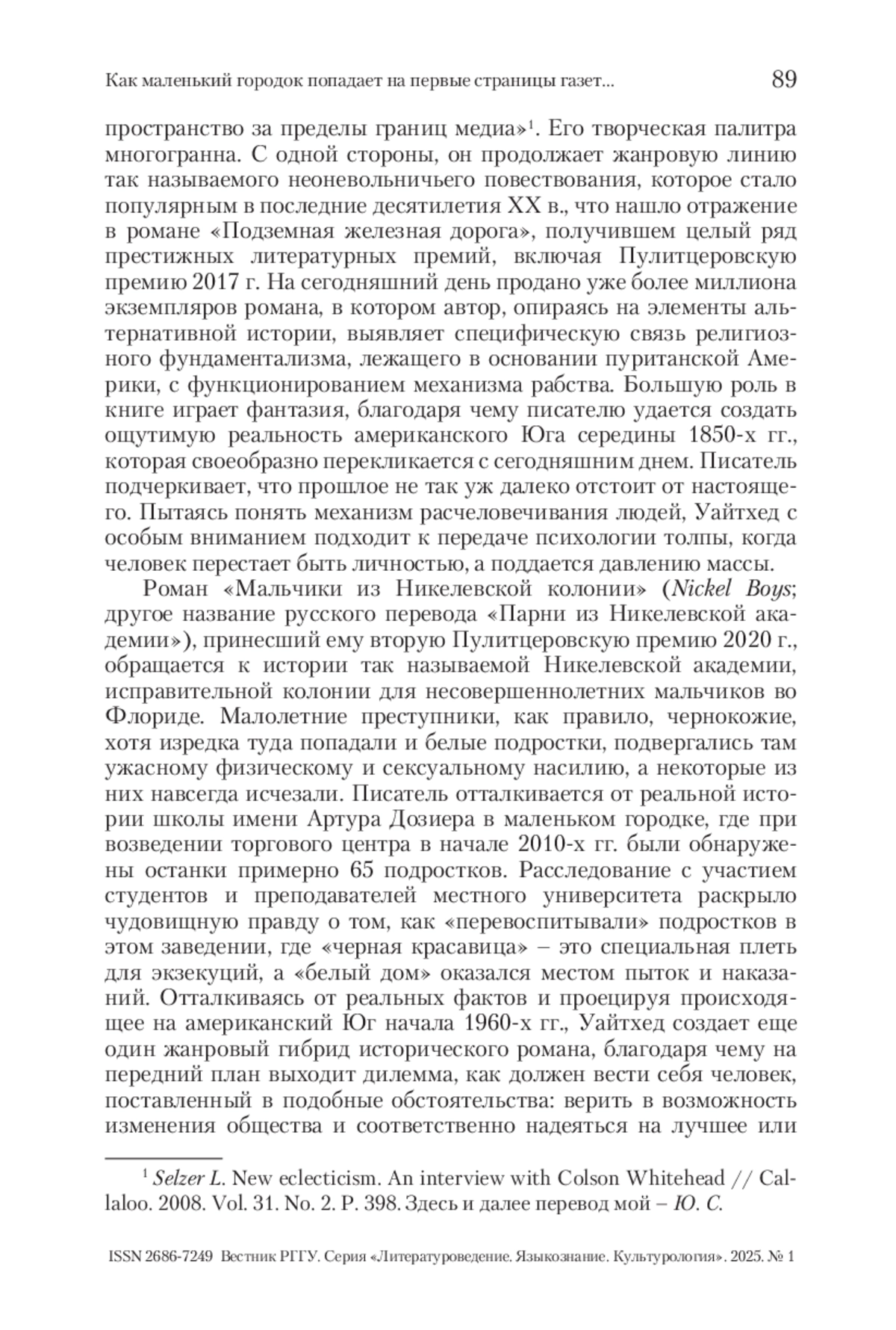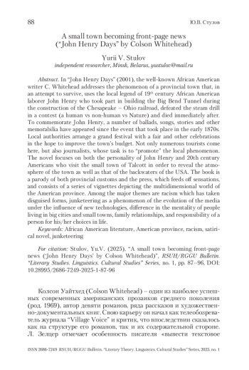 СТУЛОВ Ю. В. КАК МАЛЕНЬКИЙ ГОРОДОК ПОПАДАЕТ НА ПЕРВЫЕ СТРАНИЦЫ ГАЗЕТ (РОМАН К. УАЙТХЕДА «ДНИ ДЖОНА ГЕНРИ») // ВЕСТНИК РГГУ. СЕРИЯ «ЛИТЕРАТУРОВЕДЕНИЕ. ЯЗЫКОЗНАНИЕ. КУЛЬТУРОЛОГИЯ». 2025. № 1