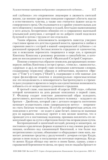 Американская готика представляет собой сложное культурное и литературное явление, обеспеченное региональной спецификой США. Под «зонтиком» термина помещаются две своеобразные традиции готической литературы – новоанглийская, в большей степени сфокусированная на погружении в глубины человеческой психики и тщательно фиксирующая различные рефлексии персонажей, и южная, обязанная своим появлением тяжелым переживаниям и размышлениям южан по поводу смерти мифологического прекрасного Юга в результате Гражданской войны. В силу специфической социокультурной жизни на Юге не было крупных урбанистических центров, сердцем Юга является глубинка, с характерной для нее укорененностью в традициях прошлого. Южная глубинка – скорее топос, обобщенное место разворачивания смыслов, связанных с уникальным южным опытом жизни, часто набор устойчивых фабульных формул, а также общих мотивов, проблем и сюжетов. В статье рассматриваются некоторые типические черты поэтики южной готики.