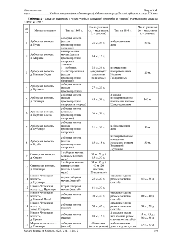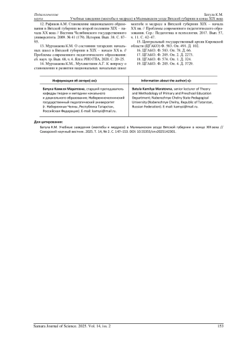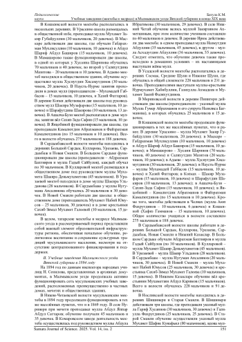 БАТУЛА К. М. УЧЕБНЫЕ ЗАВЕДЕНИЯ (МЕКТЕБЫ И МЕДРЕСЕ) В МАЛМЫЖСКОМ УЕЗДЕ ВЯТСКОЙ ГУБЕРНИИ В КОНЦЕ XIX ВЕКА // САМАРСКИЙ НАУЧНЫЙ ВЕСТНИК. 2025. ТОМ 14, № 2