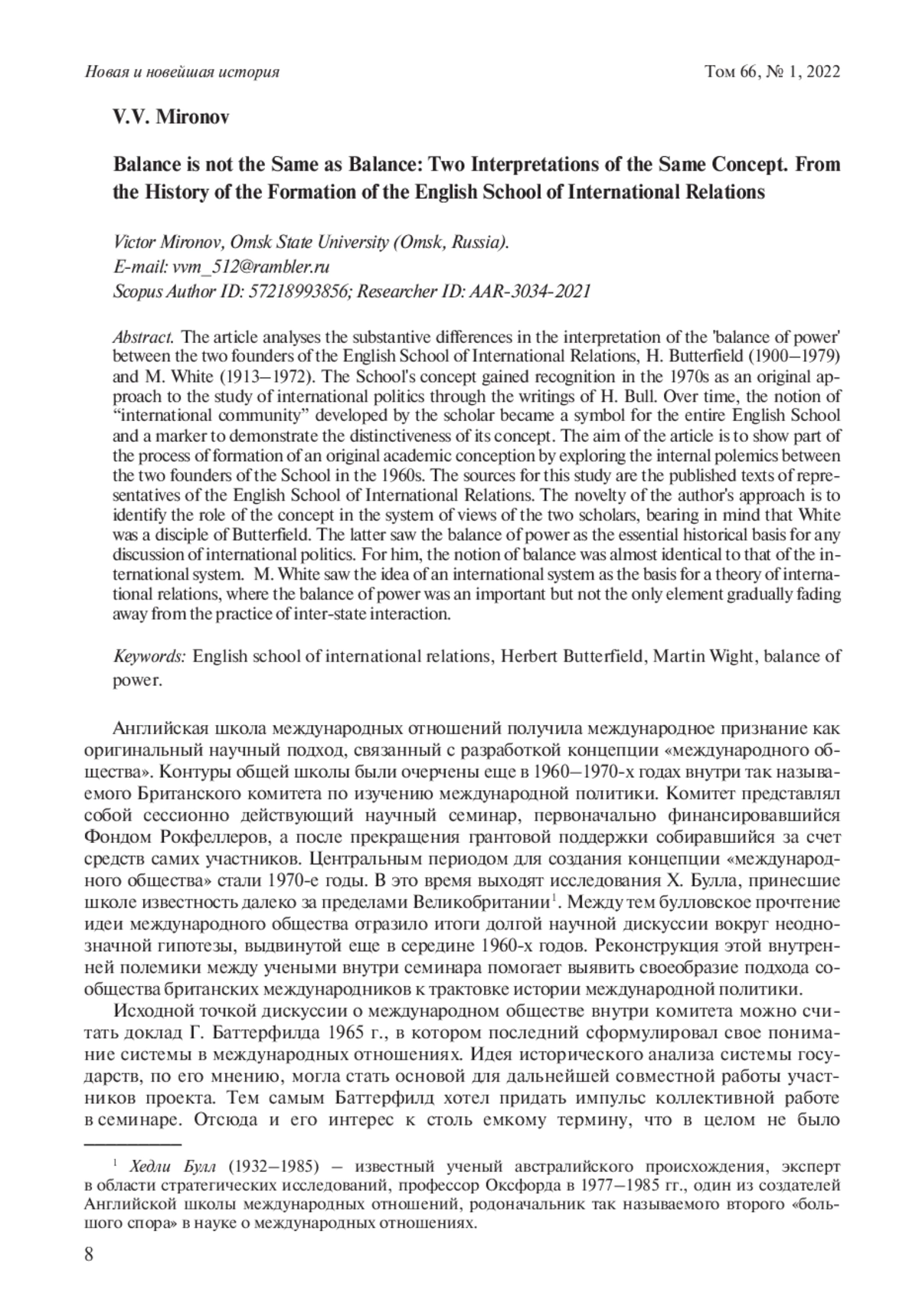 Статья посвящена анализу содержательных различий понятия «баланс сил» в системе взглядов двух основателей Английской школы международных отношений – Г. Баттерфилда (1900–1979) и М. Уайта (1913–1972). Концепция школы получила признание в 1970-е годы как оригинальный подход к изучению международной политики благодаря работам Х. Булла. Со временем понятие «международное общество», разработанное ученым, стало символом для обозначения всей Английской школы и маркером для демонстрации специфики ее концепции. Между тем книга Х. Булла отразила итоги многолетних дискуссий внутри специфического научного сообщества. Цель статьи – показать часть процесса формирования оригинальной научной концепции на примере изучения внутренней полемики двух основателей сообщества в 1960-х годах. Источниками работы послужили опубликованные тексты представителей Английской школы международных отношений. Новизна предпринятого подхода состоит в выявлении роли понятия в системе взглядов двух разных ученых, с учетом того, что Уайт был учеником Баттерфилда. Г. Баттерфилд видел в балансе сил сущностную историческую основу любых рассуждений о международной политике. Понятие баланса для него являлось интегральным концептом исторического изучения международных отношений. М. Уайт считал идею международной системы основой для создания международной теории, где баланс сил был важным, но не единственным и исчезающим элементом практики межгосударственного взаимодействия. В результате разного понимания термина «баланс сил» Баттерфилд со временем считал свою роль в создании Британского комитета по изучению международной политики исполненной к 1967 г., а Уайт сумел направить работу участников Английской школы на разработку новой теоретической гипотезы, которая привела в итоге к появлению концепции международного общества и формированию научной школы