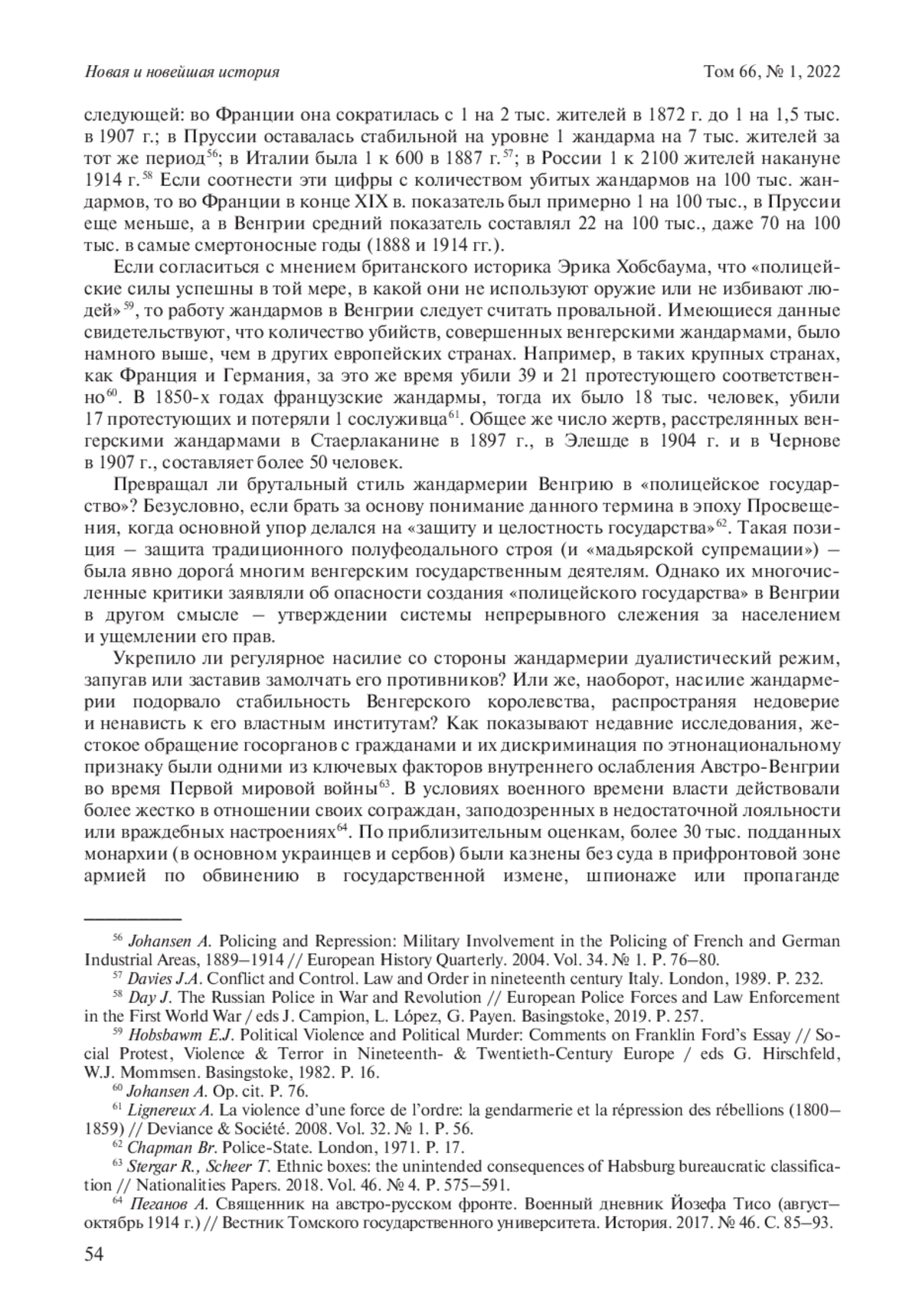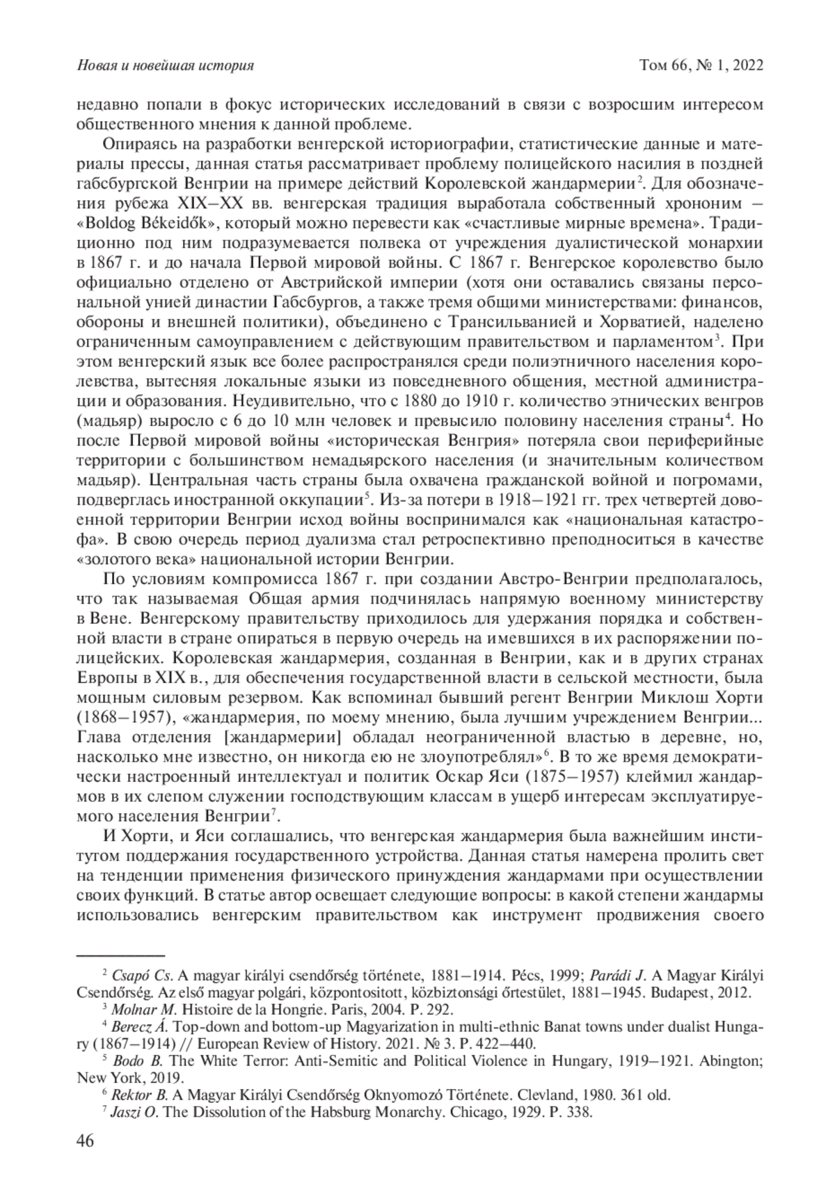 Проблема полицейского насилия остается одной из наименее исследованных сторон взаимодействия государства и общества в ХХ в. Опираясь на данные статистики и прессы, статья анализирует динамику и социально-политический контекст насилия со стороны Венгерской королевской жандармерии накануне Первой мировой войны. Жандармерия, сформированная преимущественно из этнических мадьяр в 1881 г., оказалась крупнейшей силовой структурой в непосредственном распоряжении правительства Будапешта (ее личный состав вырос с 5,5 тыс. в середине 1880-х годов до 12 тыс. к 1914 г.). За это время сфера ее ответственности в обеспечении правопорядка распространилась кроме сельской местности и на города. При этом жандармы регулярно привлекались властями для подавления массовых демонстраций и забастовок, а также организации парламентских выборов и политического сыска. Из официальных отчетов следует, что пики насилия пришлись на конец 1880-х, середину 1890-х и 1905–1910 гг. Чаще сами жандармы сталкивались с насилием в Задунайском регионе, Банате и междуречье Дунай – Тиса. Статистики погибших от рук жандармов нет, но ежегодно жандармерия отчитывалась о почти сотне случаев применения оружия. Статья предполагает, что насилие и относительная безнаказанность жандармов подрывали общественное доверие к государственной власти.
