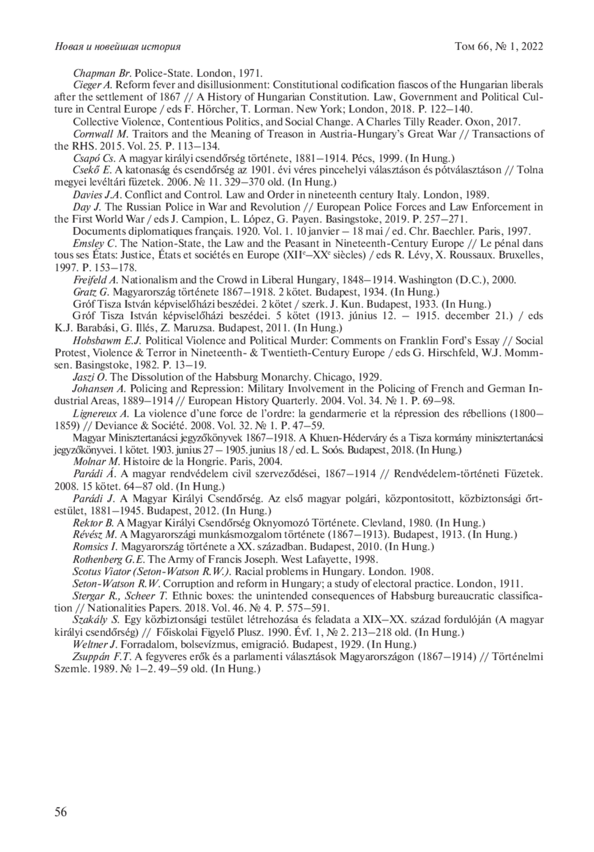 37. Szakály S. Egy közbiztonsági testület létrehozása és feladata a XIX-XX. század fordulóján (A magyar királyi csendőrség) // Főiskolai Figyelő Plusz. 1990. Évf. 1, № 2. 213-218 old. (In Hung.).