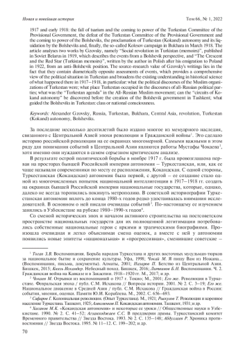 Воспоминания участника революционных событий в Туркестане публициста и литератора Александра Иосифовича Гзовского посвящены нескольким драматическим событиям, происшедшим в конце 1917 – начале 1918 г. в Средней Азии: после падения царизма к власти пришел Туркестанский комитет Временного правительства, затем после поражения последнего власть оказалась в руках большевиков, которые ликвидировали провозглашенную ранее Туркестанскую (Кокандскую) автономию, наконец, состоялся большевистский поход на Бухару в марте 1918 г., закончившийся для них полной неудачей. В статье анализируются две работы А. И. Гзовского: «Социальная революция в Туркестане (воспоминания)», где события описываются с большевистской точки зрения (издана на территории Советской Белоруссии в 1919 г.) и «Полумесяц и красная звезда (туркестанские воспоминания)», написанная автором уже с антибольшевистских позиций на польском языке после его эмиграции в Польшу в 1922 г. Источниковедческая ценность указанных работ Гзовского заключается в том, что он дает в них диаметрально противоположные оценки событий, что позволяет комплексно взглянуть на политическую ситуацию в Туркестане и расширить имеющиеся в исторической науке представления о происходившем там в 1917–1918 гг., в частности: какое место занимал Туркестан в дискурсе общероссийских политических партий; какой была «туркестанская повестка» во всероссийском мусульманском движении; можно ли обнаружить «контуры Кокандской автономии» до создания большевистского правительства в Ташкенте; чем руководствовались большевики в Туркестане: классовым или национальным сознанием?