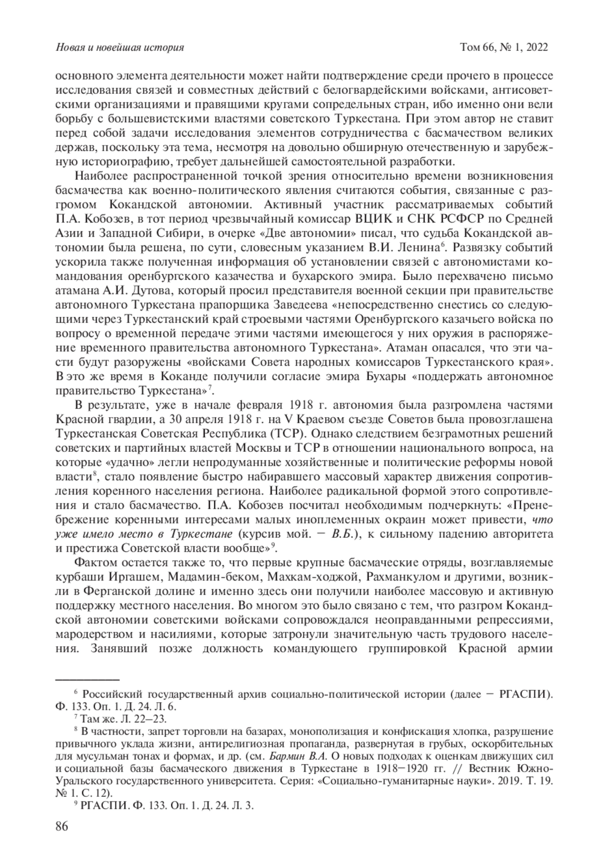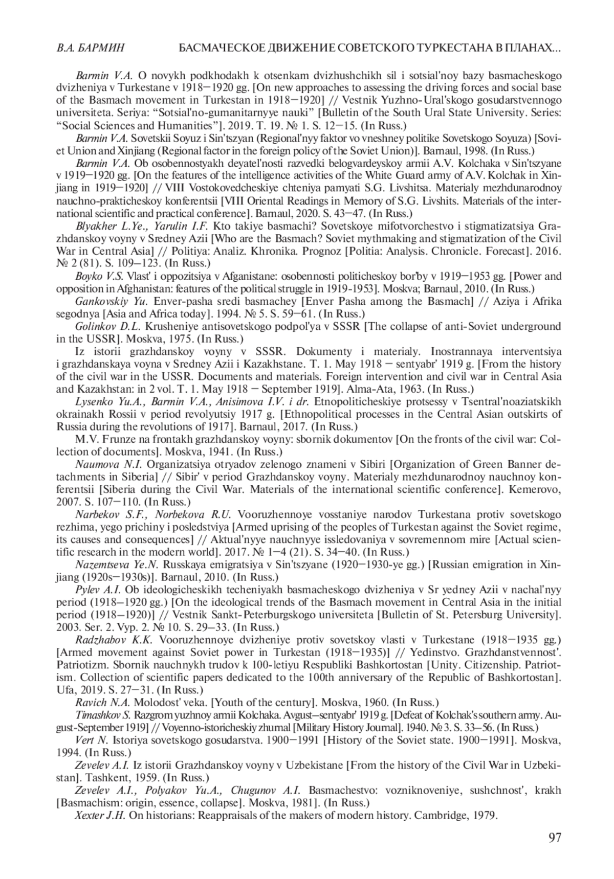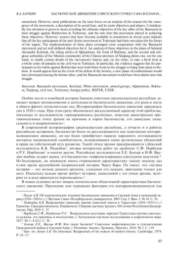 4. Бармин В.А. О новых подходах к оценкам движущих сил и социальной базы басмаческого движения в Туркестане в 1918-1920 гг. // Вестник Южно-Уральского государственного университета. Серия: “Социально-гуманитарные науки”. 2019. Т. 19. № 1. С. 12-15. EDN: YTCVGX