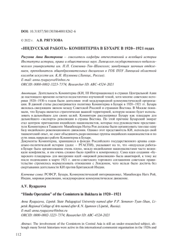 Деятельность Коминтерна (КИ, III Интернационал) в странах Центральной Азии до настоящего времени остается недостаточно изученной темой, хотя многие советские историки 1920–1930-х годов были деятелями этой международной коммунистической организации. В данной статье рассматривается политика Коминтерна в Бухаре в 1920–1921 гг. Бухара являлась связующим звеном между Советской Россией и странами Востока. В Москве понимали, что Бухара является стратегически важной территорией, которую можно будет использовать в дальнейшем для своих целей. Коминтерн рассматривал Бухару как плацдарм для дальнейшего «экспорта» революции в страны Востока. По этой причине Бухарский эмират стал центром притяжения индийских националистов, которые под руководством представителя Коминтерна в Ташкенте Манабендра Натха Роя должны были организовать там еще одну базу индийского революционного движения. Однако этот представитель КИ, используя свой ташкентский опыт, не смог объединить разрозненные группы индийских националистов и по сути лишь навредил работе Коминтерна в Бухаре.