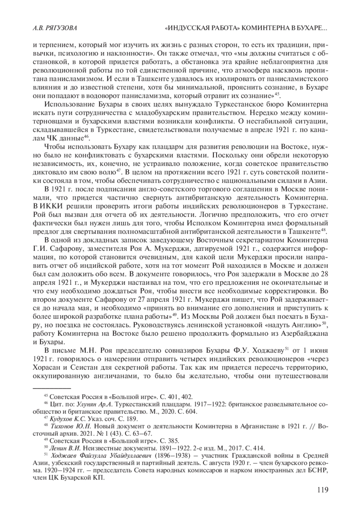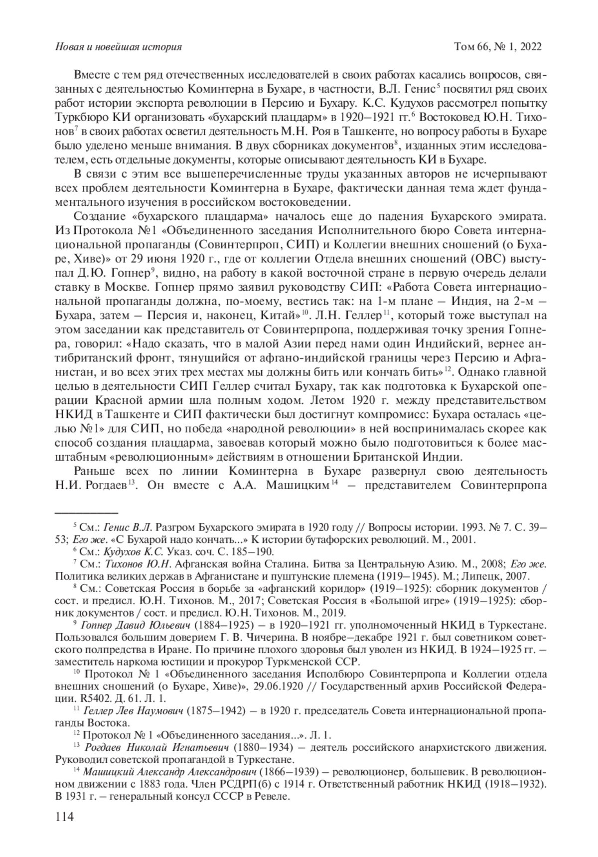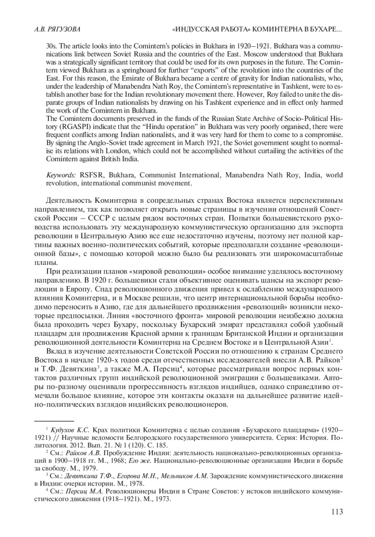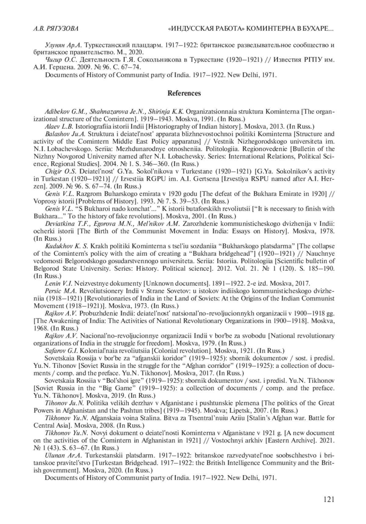 7. Кудухов К.С. Крах политики Коминтерна с целью создания “Бухарского плацдарма” (1920-1921) // Научные ведомости Белгородского государственного университета. Серия: История. Политология. 2012. Вып. 21. № 1(120). С. 185-190.