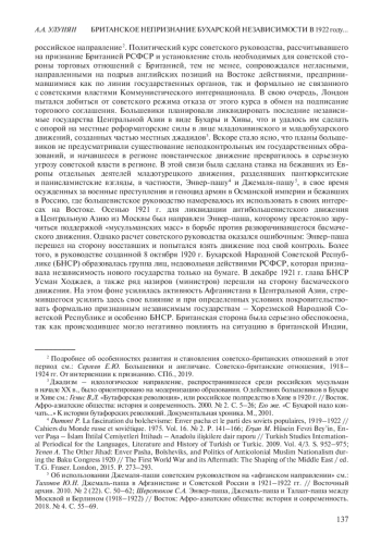 Участие Британии в делах Центрально-Азиатского региона в первой четверти XX в. стало самостоятельным историографическим направлением и продолжает сохранять свою актуальность по мере увеличивающегося объема доступных архивных материалов как британского и российского происхождения, так и отложившихся в хранилищах других стран, имевших непосредственное отношение к событиям в регионе. Независимые государственные образования в Центральной Азии в виде Бухарского эмирата и Хорезмского государства (Хивинского ханства), являвшиеся автономиями в составе Российской империи, просуществовали недолго – со времени Февральской революции 1917 г. до 1920 г., когда Красной армией в Хиве 2 февраля был свергнут Саид Абдуллахан, а в Бухаре 2 сентября – Сеид Алим-хан. На протяжении 1917–1920 гг. наблюдалась уникальная ситуация с точки зрения общего политического положения в регионе: наряду с этими государствами в Центральной Азии существовала созданная большевиками и находившаяся под их контролем советская Туркестанская республика – своеобразный плацдарм для развертывания революции на Востоке.