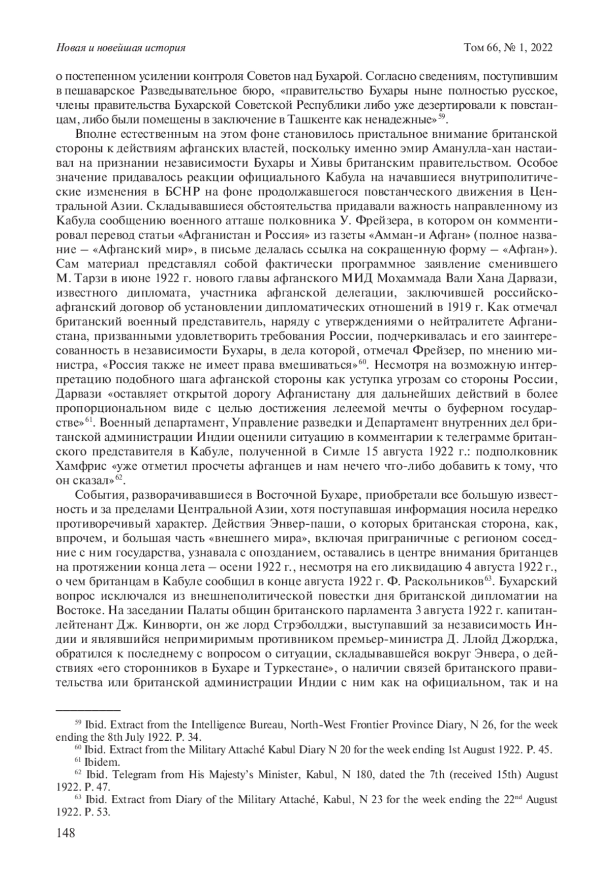 Статья посвящена изучению и оценке британцами ситуации в Бухаре, сложившейся зимой 1921–1922 гг., сразу после раскола союза большевиков и младобухарцев, который осенью 1920 г. привел к созданию т. н. Бухарской Народной Советской Республики (БСНР). На основе британских архивных источников в статье исследуются процесс принятия решений, прогнозы будущего развития и освещается механизм взаимодействия между различными учреждениями администрации Британской Индии и ее решения по англобухарским отношениям. Соединенному Королевству было необходимо предотвратить любую угрозу своим индийским владениям. Поэтому признание независимой государственности Бухары сразу после свержения эмира большевиками и младобухарцами и установления просоветского режима приобрело особую важность. Проблема признания затрагивала широкий круг вопросов, в том числе британских позиций на Востоке, связей Британии с отдельными странами региона, в первую очередь с Афганистаном, и установление отношений с Советской Россией, которая, с одной стороны, проявляла свою заинтересованность в налаживании отношений с Британией, а с другой – занималась антибританской деятельностью на Востоке, главным образом в Индии. Афганские власти, преследовавшие собственные цели в Центральной Азии, настойчиво обращались к англичанам с призывом признать независимость Бухары, ссылаясь на советский и афганский примеры. Британские дипломаты осторожно реагировали на все обращения, не теряя из виду афганские планы и цели Лондона. Их окончательный отказ от участия в бухарском хаосе вызван в большей степени отсутствием реальной силы, на которую англичане могли бы опереться. Таким образом, сама идея британского признания оказалась нежизнеспособна из-за характера марионеточного режима, установленного в БНСР, и из-за нежелания британцев обострять отношения с Советской Россией