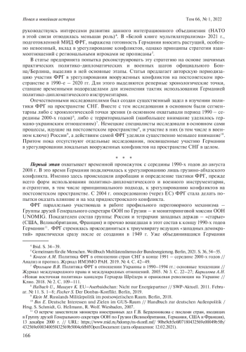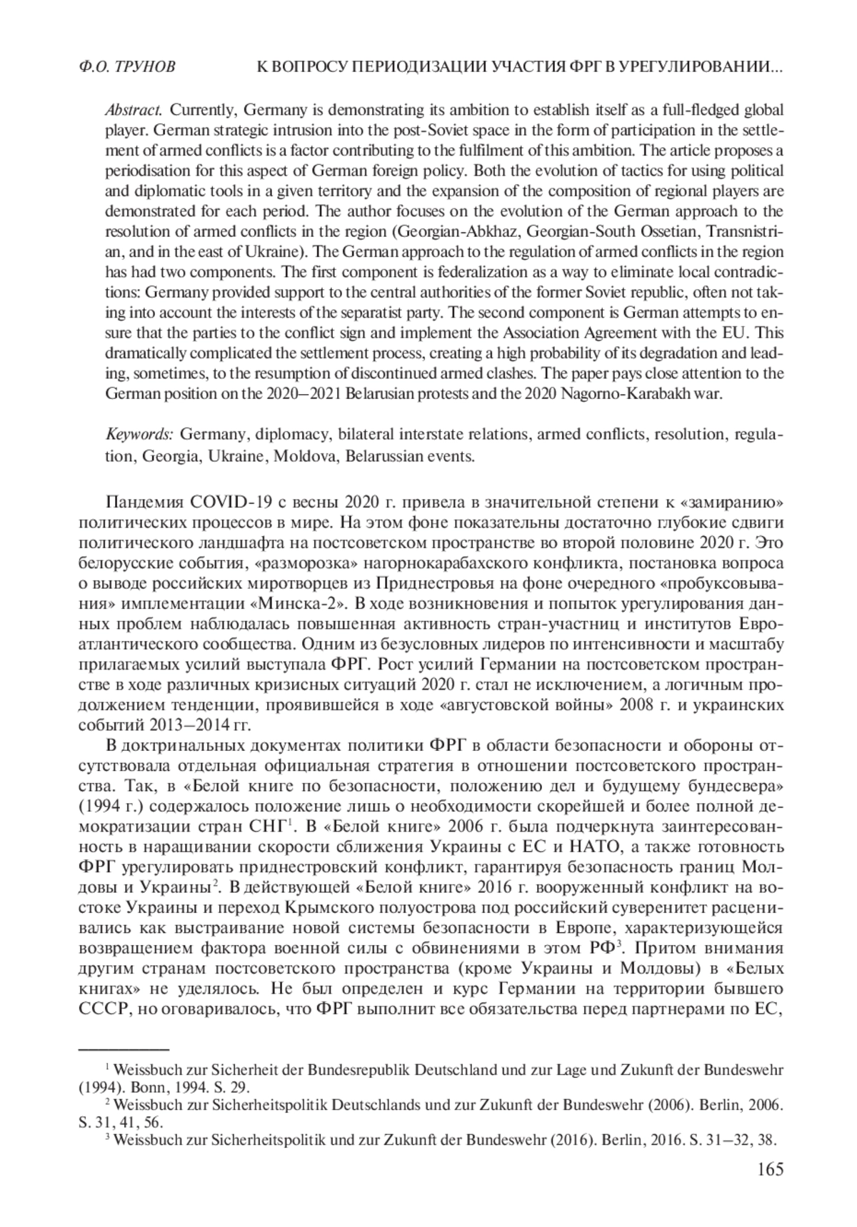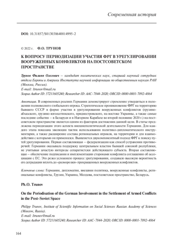 В современных реалиях Германия демонстрирует стремление утвердиться в положении полновесного глобального игрока. Стратегическое проникновение ФРГ на территорию бывшего СССР в форме участия в урегулировании вооруженных конфликтов (грузиноабхазского, грузино-югоосетинского, приднестровского, на востоке Украины, а также самые последние события – в Беларуси и в Нагорном Карабахе во второй половине 2020 г.) на постсоветском пространстве является одним из факторов достижения данной цели. В статье предложена периодизация этого аспекта внешнеполитической деятельности Германии. Для каждого этапа показана эволюция тактик использования политико-дипломатического инструментария, а также расширение состава региональных игроков, на территории и для взаимодействия с которыми он применялся. Выявляется двукомпонентный подход ФРГ к поиску путей урегулирования. Первая составляющая – федерализация как способ устранения противоречий: Германия оказывала поддержку центральным властям бывшей союзной республики, не учитывая зачастую интересы сепаратистски действующего субъекта. Вторая составляющая – обеспечение подписания и имплементации сторонами конфликта соглашения об ассоциации с ЕС. Это резко усложняло процесс урегулирования, создавало высокую вероятность его деградации вплоть до «разморозки» прекращенных вооруженных конфликтов.
