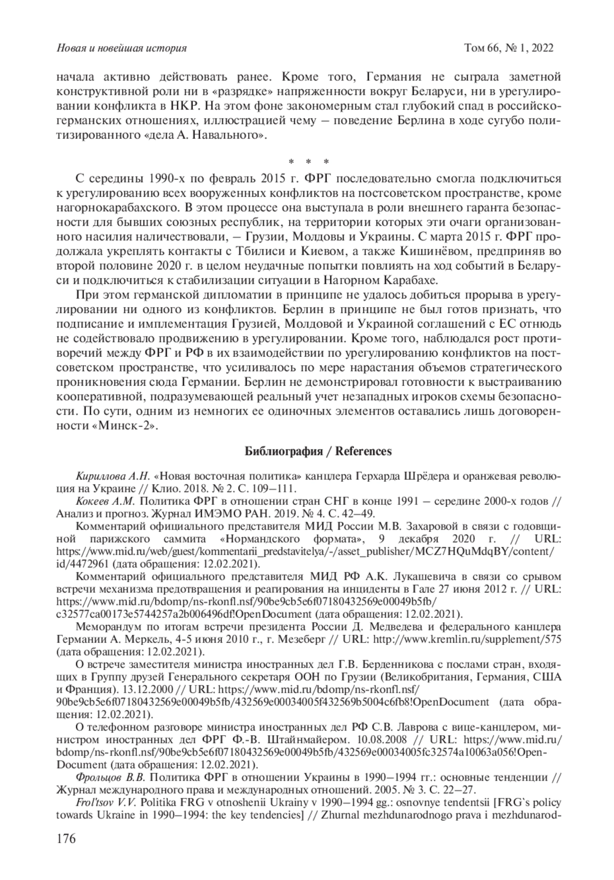 11. Kokeev A.M. Politika FRG v otnoshenii stran SNG v kontse 1991 - seredine 2000-kh godov [FRG’s policy towards the states of Post-Soviet space since the end of 1991 until middle 2020-s] // Analiz i prognoz. Zhurnal IMEMO RANn [Analysis and forecast. IMEMO RAS Journal]. 2019. № 4. S. 42-49. (In Russ.).