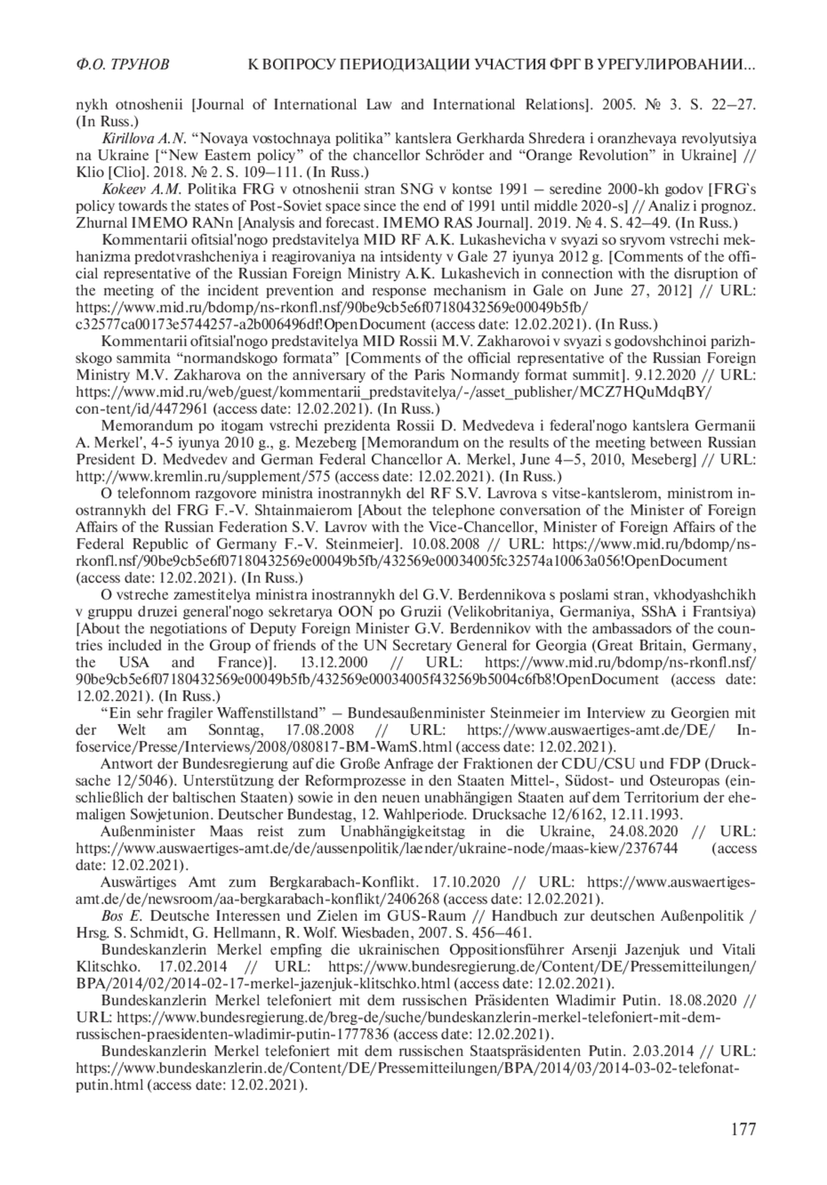13. Kommentarii ofitsial’nogo predstavitelya MID Rossii M.V. Zakharovoi v svyazi s godovshchinoi parizhskogo sammita “normandskogo formata” [Comments of the official representative of the Russian Foreign Ministry M.V. Zakharova on the anniversary of the Paris Normandy format summit]. 9.12.2020 // URL: https://www.mid.ru/web/guest/kommentarii_predstavitelya/-/asset_publisher/MCZ7HQuMdqBY/content/id/4472961 (access date: 12.02.2021). (In Russ.).