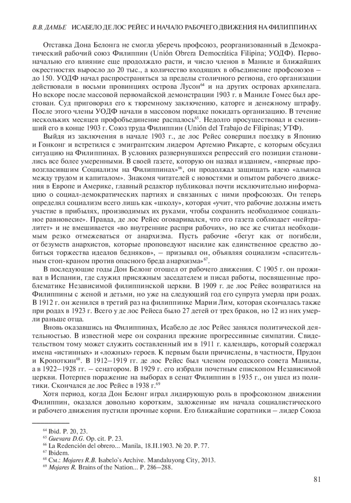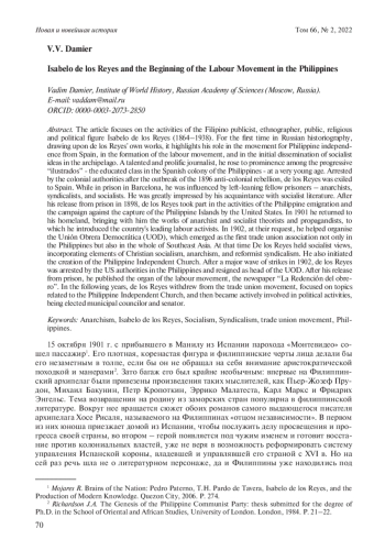 Статья посвящена деятельности филиппинского публициста, этнографа, общественного, религиозного и политического деятеля Исабело де лос Рейеса (1864–1938). В ней впервые в российской историографии с опорой на его собственные произведения показана роль де лос Рейеса в движении за независимость Филиппин, в становлении рабочего движения и начале распространения социалистических идей на архипелаге. Талантливый и плодовитый журналист, он уже в молодости выдвинулся в первые ряды прогрессивных представителей «илустрадос» – образованного класса испанской колонии Филиппины. Арестованный колониальными властями после начала антиколониального восстания в 1896 г. де лос Рейес был выслан в Испанию. Находясь в тюрьме в Барселоне, он испытал влияние со стороны политических заключенных с левыми взглядами – анархистов, синдикалистов и социалистов. Большое впечатление произвело на него знакомство с социалистической литературой. После освобождения из тюрьмы в 1898 г. де лос Рейес принимал участие в деятельности филиппинской эмиграции и кампании против захвата Филиппинских островов США. В 1901 г. он возвратился на родину, ставшую колонией США, и привез с собой произведения анархистских и социалистических теоретиков и пропагандистов, с которыми познакомил ведущих рабочих активистов страны. По их просьбе он помог в организации в 1902 г. «Демократического рабочего союза» (УОД), который стал первым объединением профсоюзов не только на Филиппинах, но и во всей Юго-Восточной Азии. Де лос Рейес придерживался в этот период социалистических взглядов, в которых смешивались элементы христианского социализма, анархизма и реформистского синдикализма. Он выступил также инициатором создания Филиппинской независимой церкви. После волны забастовок в 1902 г. де лос Рейес был арестован американскими властями Филиппин и подал в отставку с поста руководителя УОД. После освобождения из заключения в 1903 г. он издавал печатный орган рабочего движения – газету «La Redención del obrero». В последующие годы де лос Рейес отошел от профсоюзного движения, сосредоточился на темах, связанных с Филиппинской независимой церковью, а затем занялся парламентско-политической деятельностью, был избран муниципальным советником и сенатором