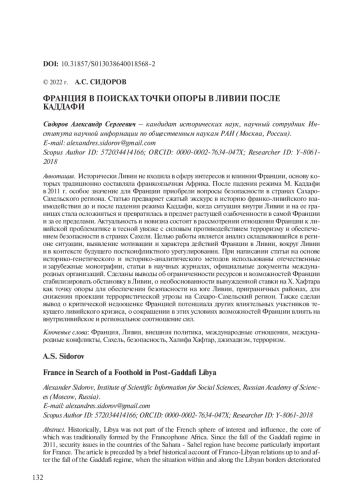 Исторически Ливия не входила в сферу интересов и влияния Франции, основу которых традиционно составляла франкоязычная Африка. После падения режима М. Каддафи в 2011 г. особое значение для Франции приобрели вопросы безопасности в странах СахароСахельского региона. Статью предваряет сжатый экскурс в историю франко-ливийского взаимодействия до и после падения режима Каддафи, когда ситуация внутри Ливии и на ее границах стала осложняться и превратилась в предмет растущей озабоченности в самой Франции и за ее пределами. Актуальность и новизна состоят в рассмотрении отношения Франции к ливийской проблематике в тесной увязке с силовым противодействием терроризму и обеспечением безопасности в странах Сахеля. Целью работы является анализ складывающейся в регионе ситуации, выявление мотивации и характера действий Франции в Ливии, вокруг Ливии и в контексте будущего постконфликтного урегулирования. При написании статьи на основе историко-генетического и историко-аналитического методов использованы отечественные и зарубежные монографии, статьи в научных журналах, официальные документы международных организаций. Сделаны выводы об ограниченности ресурсов и возможностей Франции стабилизировать обстановку в Ливии, о необоснованности вынужденной ставки на Х. Хафтара как точку опоры для обеспечения безопасности на юге Ливии, приграничных районах, для снижения проекции террористической угрозы на Сахаро-Сахельский регион. Также сделан вывод о критической недооценке Францией потенциала других влиятельных участников текущего ливийского кризиса, о сокращении в этих условиях возможностей Франции влиять на внутриливийское и региональное соотношение сил