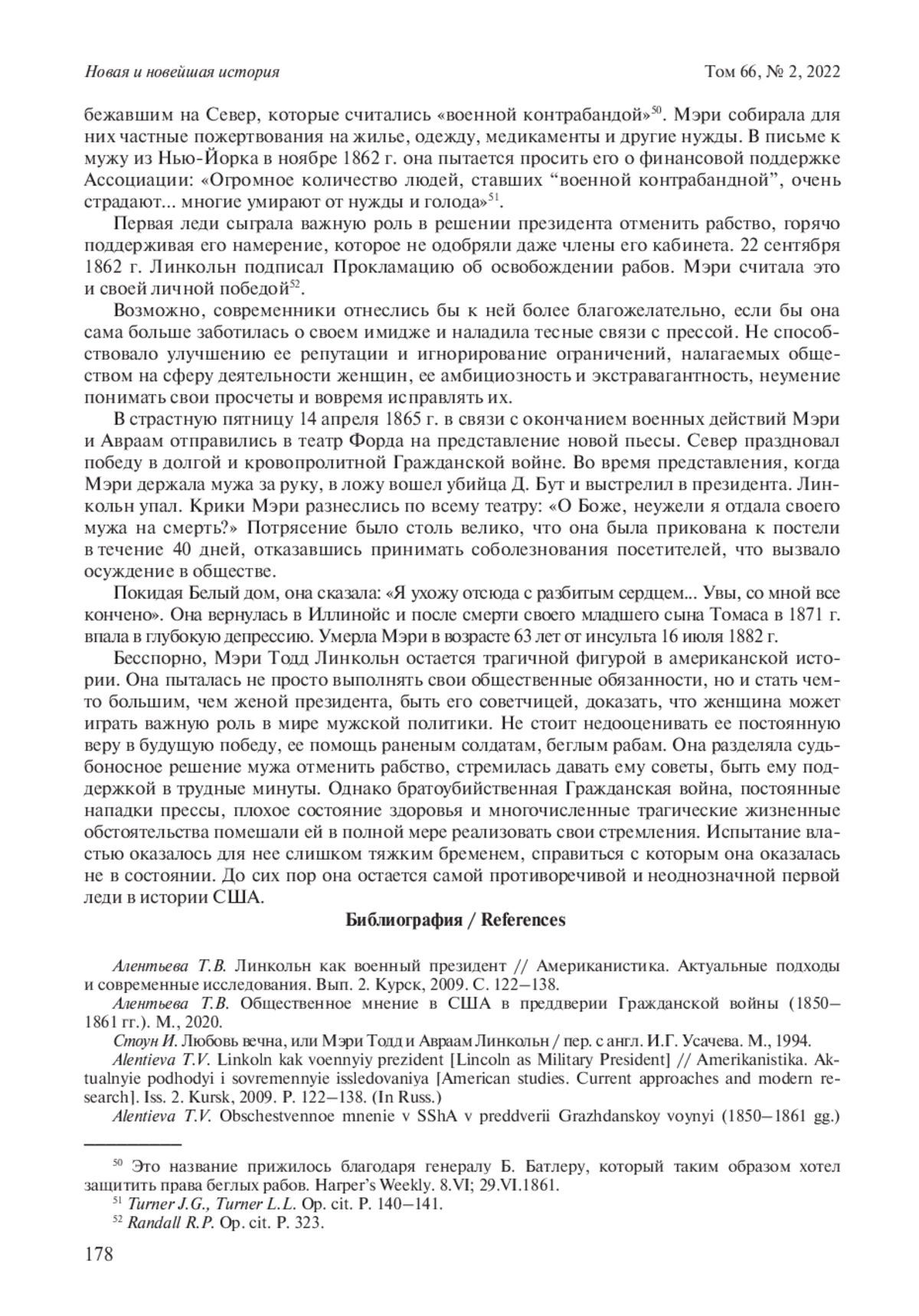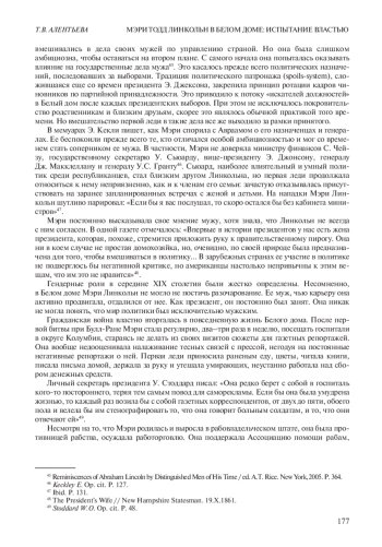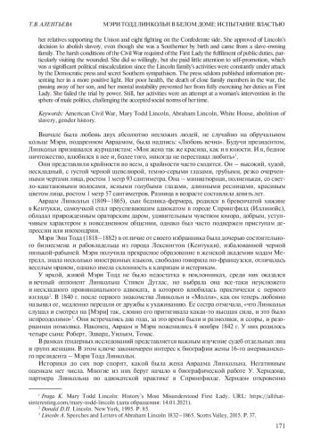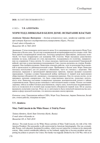 АЛЕНТЬЕВА Т. В. МЭРИ ТОДД ЛИНКОЛЬН В БЕЛОМ ДОМЕ: ИСПЫТАНИЕ ВЛАСТЬЮ // НОВАЯ И НОВЕЙШАЯ ИСТОРИЯ. 2022. № 2