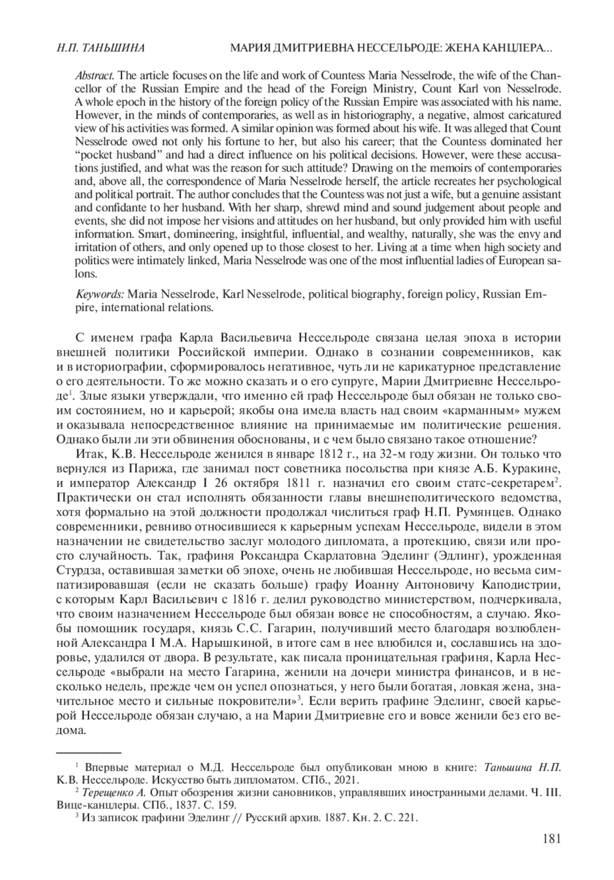 В центре внимания статьи – жизнь и деятельность графини М. Д. Нессельроде, супруги канцлера Российской империи и главы внешнеполитического ведомства графа К. В. Нессельроде. С его именем была связана целая эпоха в истории внешней политики Российской империи. Однако в сознании современников, как и в историографии, сформировалось негативное, чуть ли не карикатурное представление о его деятельности. Аналогичное мнение бытовало и относительно его супруги. Какими только оскорбительными эпитетами не награждали ее современники! Утверждали, что именно ей граф Нессельроде был обязан не только своим состоянием, но и карьерой; что Мария Дмитриевна имела власть над своим «карманным» мужем и оказывала непосредственное влияние на принимаемые им политические решения. Однако были ли эти обвинения обоснованы, и с чем было связано такое отношение? По воспоминаниям современников, и прежде всего по переписке М. Д. Нессельроде, в статье воссоздается ее психолого-политический портрет. Делается вывод, что Мария Дмитриевна была не просто женой, а настоящей помощницей и корреспондентом своего мужа. Обладая острым, проницательным умом, здраво рассуждая о людях и событиях, она не навязывала свою позицию мужу, а лишь снабжала его полезной ему информацией. Умная, властная, проницательная, влиятельная, богатая, конечно, она вызывала зависть и раздражение у окружающих, а раскрывалась только перед близкими людьми. Живя в эпоху, когда свет и политика были теснейшим образом взаимосвязаны, Мария Дмитриевна относилась к плеяде влиятельных хозяек европейских салонов