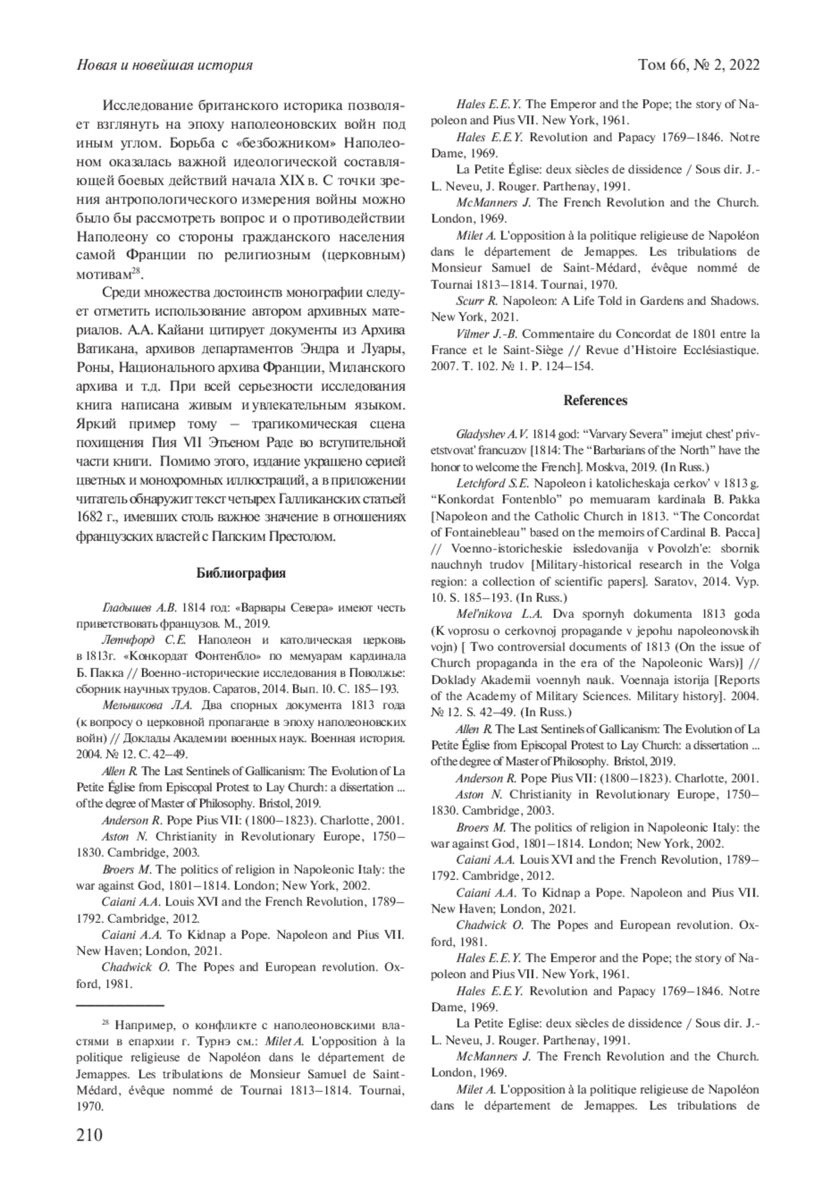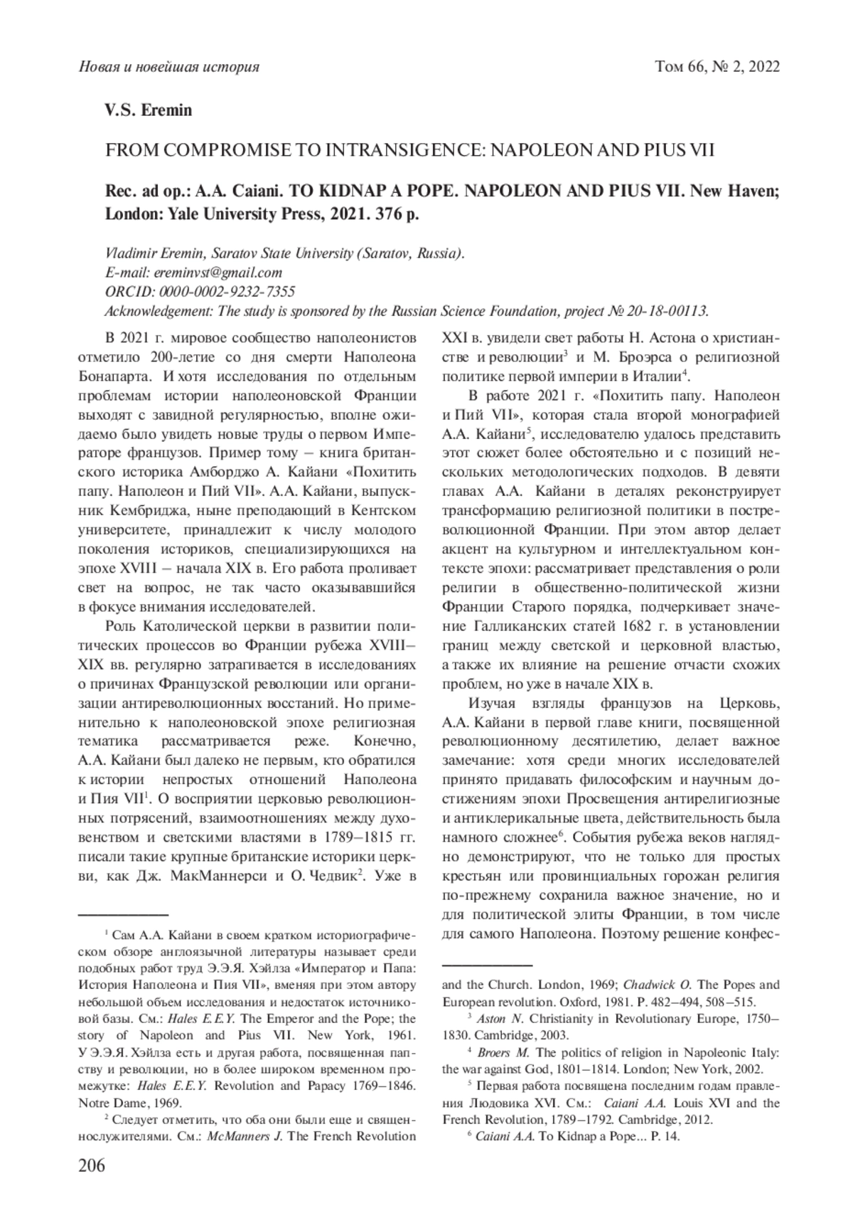 ЕРЕМИН В. С. ОТ КОМПРОМИССА К НЕПРИМИРИМОСТИ: НАПОЛЕОН И ПИЙ VII (A. A. CAIANI. TO KIDNAP A POPE. NAPOLEON AND PIUS VII. NEW HAVEN; LONDON, 2021) // НОВАЯ И НОВЕЙШАЯ ИСТОРИЯ. 2022. № 2