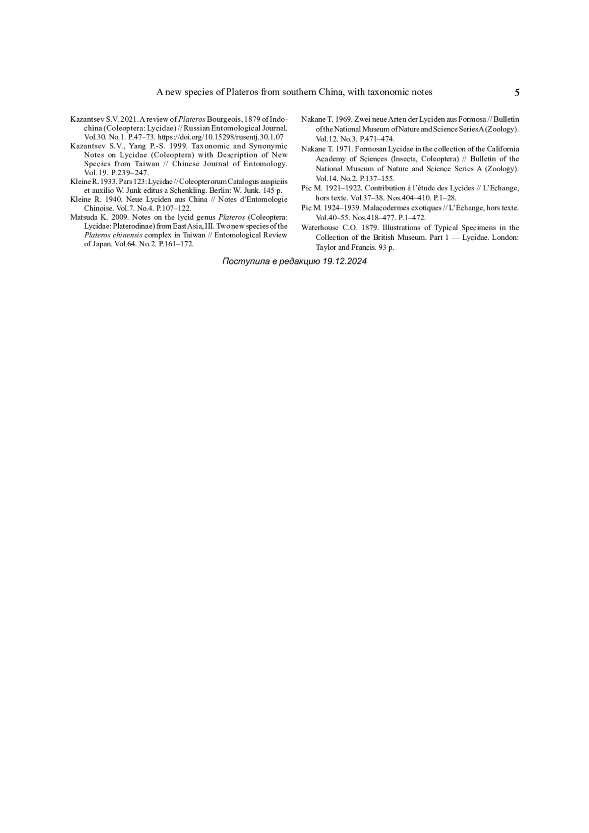 6. Fang C., Yang Y., Yang X., Liu H. 2024. A review of Plateros Bourgeois, 1879 (Coleoptera: Lycidae) from southeastern China, with descriptions of six new species from the Nanling Mountains // Zootaxa. Vol.5528. No.1. P.133-152. DOI: 10.11646/zootaxa.5528.1.12