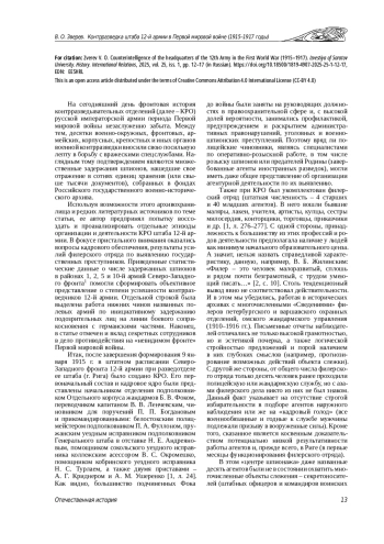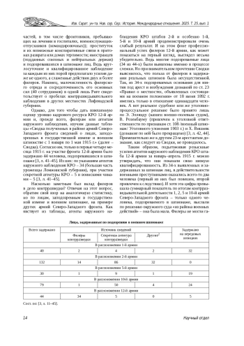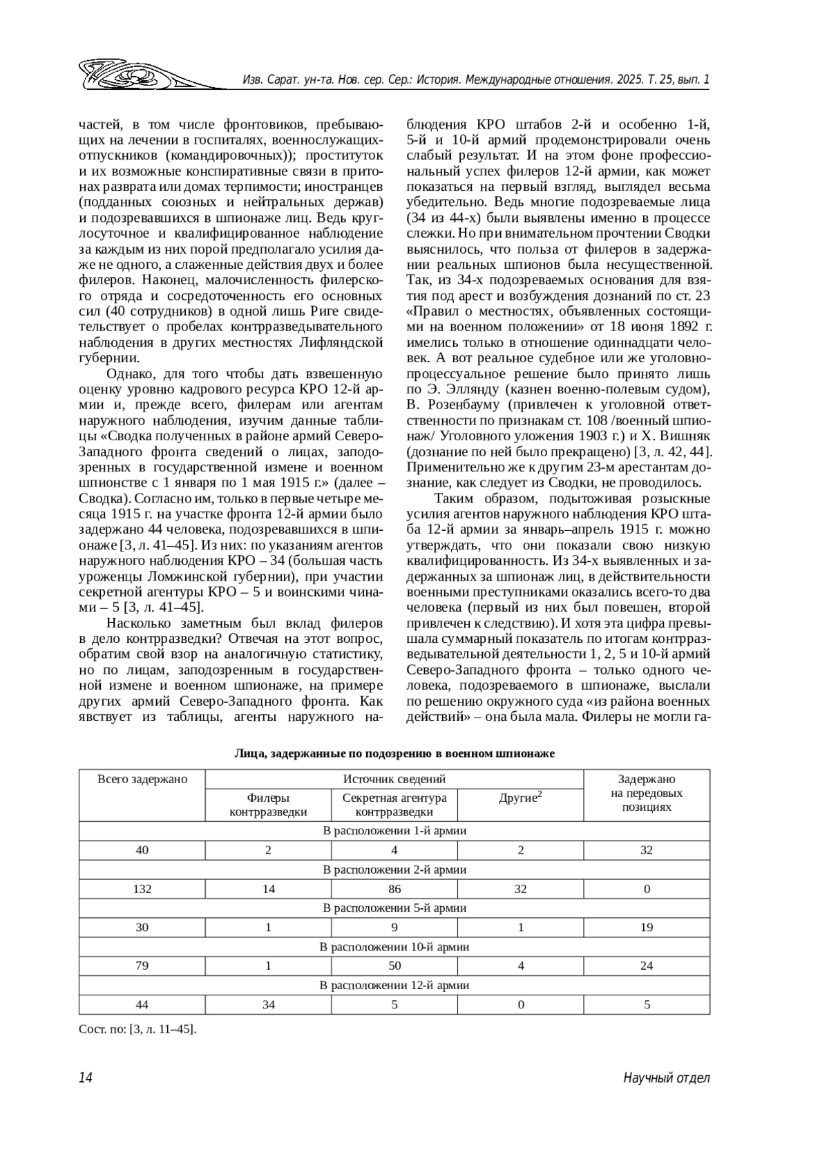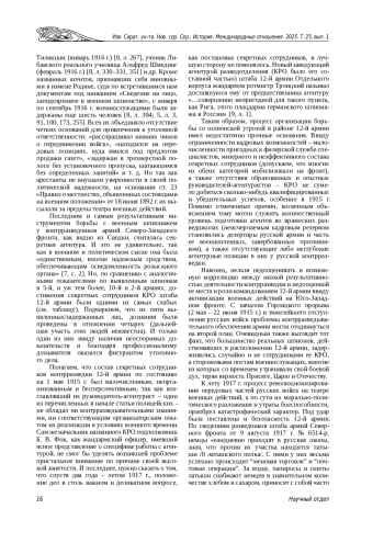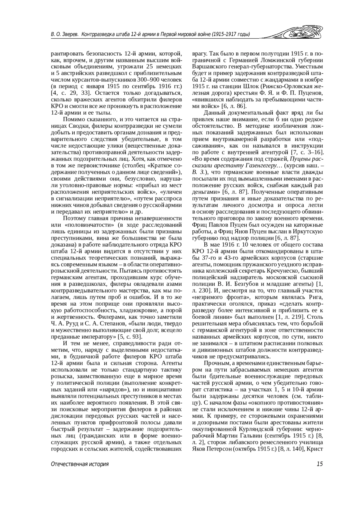 Рассматривается малоизвестная история контрразведывательного отделения штаба 12-й армии сквозь призму деятельности двух инструментов противодействия шпионажу – филерского отряда и секретных сотрудников. С опорой на введенные в научный оборот незнакомые архивные документы (переписка контрразведки с жандармскими управлениями, приказы по 12-й армии, сведения на лиц, заподозренных в военном шпионаже, рапорты о задержании шпионов, списки агентов и др.) делается вывод о неудовлетворительных итогах работы армейской контрразведки. Ее наблюдательные агенты (филеры) показали свою профессиональную непригодность. Главным образом это выражалось в отсутствии достаточных юридических и специальных познаний, практического опыта. В редких случаях задержания государственных преступников (германские, реже австрийские, агенты, они же предатели Родины) с участием филеров завершались дознанием или расследованием с последующей судебной перспективой. Вторая категория – секретные сотрудники – также демонстрировали низкий результат своей деятельности. Да и можно ли было надеяться на успех, если ее организация имела слабые основания. Практически весь руководящий состав контрразведки 12-й армии (за исключением ее начальника) был представлен полицейскими, которые не владели организационно-тактическими приемами и методами выявления шпионов. В силу своих должностных обязанностей полицейские чины занимались лишь постановкой их розыска(розыском уже установленных лиц). И поэтому основная масса шпионов задерживалась случайно и, как правило, на передней линии обороны 12-й армии, благодаря бдительности и наблюдательности ее военнослужащих.