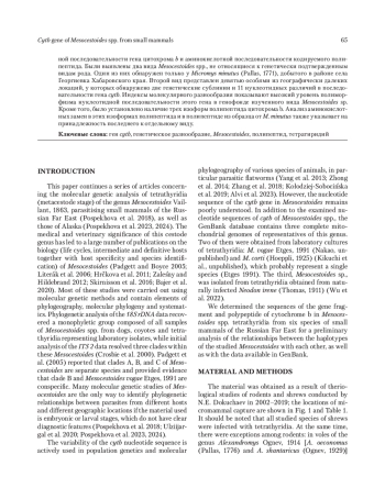Данная работа продолжает серию статей, посвященных молекулярно-генетическому анализу широко распространенных гельминтов – цестод рода Mesocestoides, паразитирующих (на стадии метацестоды) у мелких млекопитающих. В этой работе мы изучаем генетическое разнообразие Mesocestoides spp. от микромаммалий Дальнего Востока России на примере гена cytb. Впервые у Mesocestoides spp., паразитирующих у хозяев разных родов и видов, обитающих в этом регионе, выявлен полиморфизм нуклеотидной последовательности гена цитохрома b и аминокислотной последовательности кодируемого полипептида. Были выявлены два вида Mesocestoides spp., не относящиеся к генетически подтвержденным видам рода. Один из них обнаружен только у Micromys minutus (Pallas, 1771), добытого в районе села Георгиевка Хабаровского края. Второй вид представлен девятью особями из географически далеких локаций, у которых обнаружено две генетические сублинии и 11 нуклеотидных различий в последовательности гена cytb. Индексы молекулярного разнообразия показывают высокий уровень полиморфизма нуклеотидной последовательности этого гена в генофонде изученного вида Mesocestoides sp. Кроме того, было установлено наличие трех изоформ полипептида цитохрома b. Анализ аминокислотных замен в этих изоформах полипептида и в полипептиде из образца от M. minutus также указывает на принадлежность последнего к отдельному виду.