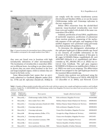 20. Pospekhova N.A., Pereverzeva V.V. and Dokuchaev N.E. 2018. The first molecular genetic data on the tetrathyridia of the genus Mesocestoides from the red-backed vole from Magadan province. Parazitologiya, 52(5): 382-394. [In Russian]. DOI: 10.7868/S0031184718050037