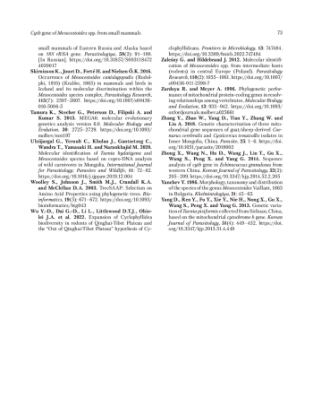 21. Pospekhova N.A., Pereverzeva V.V., Dokuchaev N.E. and Primak A.A. 2023. Phylogenetic relationships of representatives of the genus Mesocestoides Vaillant, 1863 from small mammals in the East of Russia and Alaska. Bulletin of the North-East Research Center FEB RAS, 3: 67-79. [In Russian]. DOI: 10.34078/1814-0998-2023-3-67-79