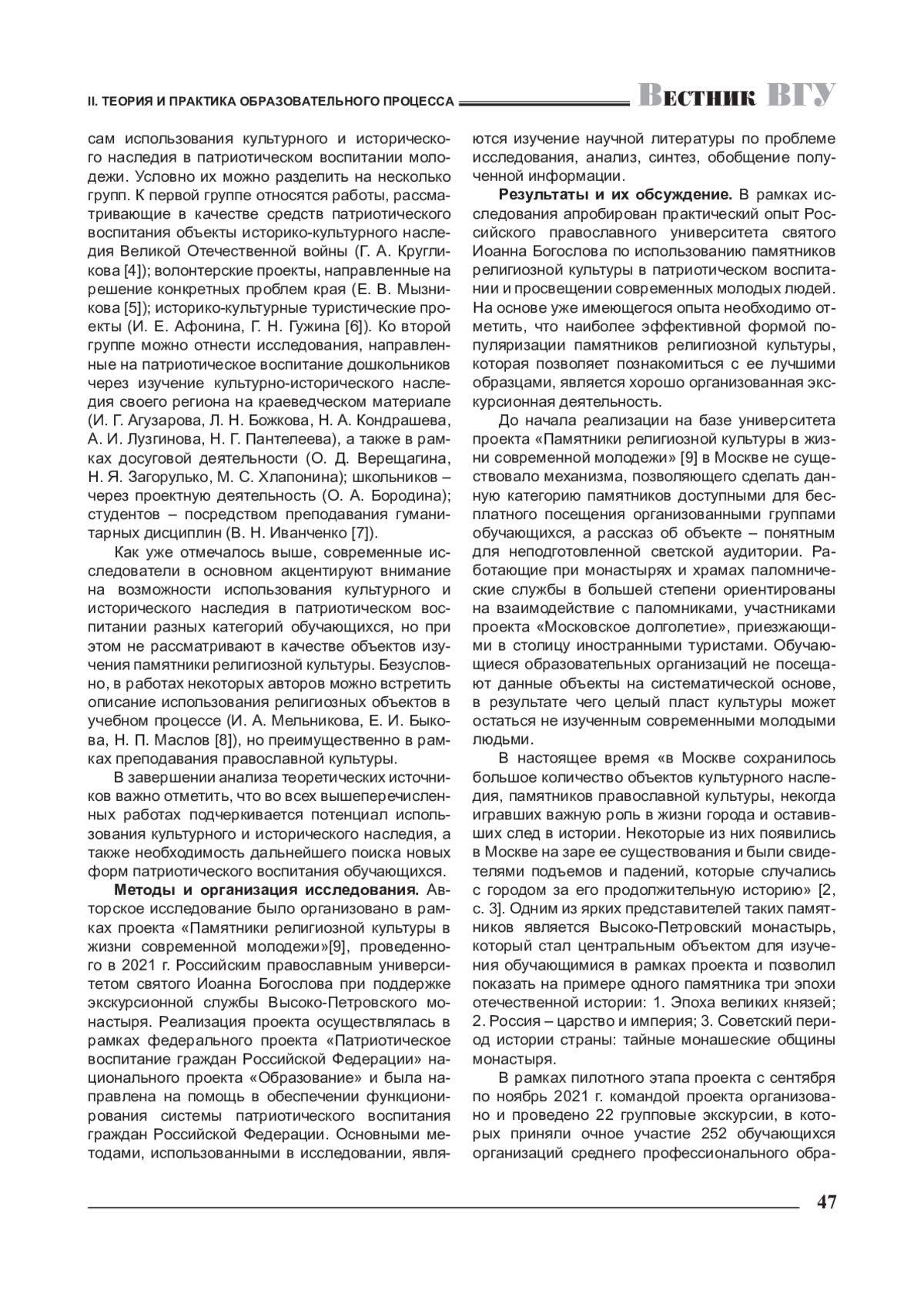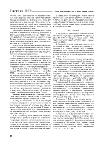 7. Иванченко В. Н. Духовно-патриотическое воспитание студентов на основе изучения исторического и культурного наследия / В. Н. Иванченко // Научное значение трудов К. Э. Циолковского: история и современность. Материалы 55-х Научных чтений памяти К. Э. Циолковского. - Калуга: Изд-во “Инд. предприниматель Стрельцов Илья Анатольевич”, 2020. - Ч. 2. - С. 252-255. EDN: ERTHQW