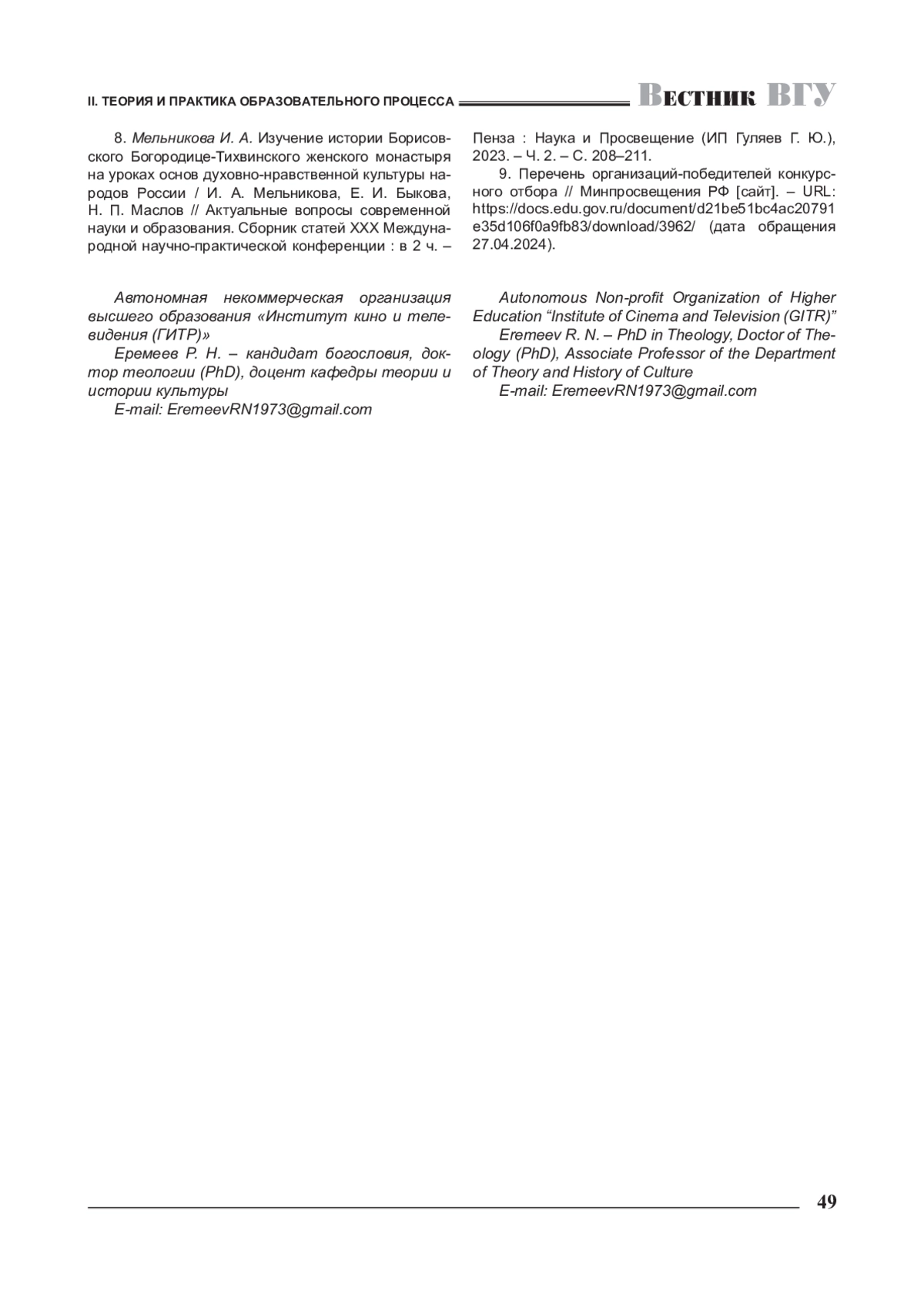 8. Мельникова И. А. Изучение истории Борисовского Богородице-Тихвинского женского монастыря на уроках основ духовно-нравственной культуры народов России / И. А. Мельникова, Е. И. Быкова, Н. П. Маслов // Актуальные вопросы современной науки и образования. Сборник статей XXX Международной научно-практической конференции: в 2 ч. -Пенза: Наука и Просвещение (ИП Гуляев Г. Ю.),2023. - Ч. 2. - С. 208-211. EDN: JPRMUI
