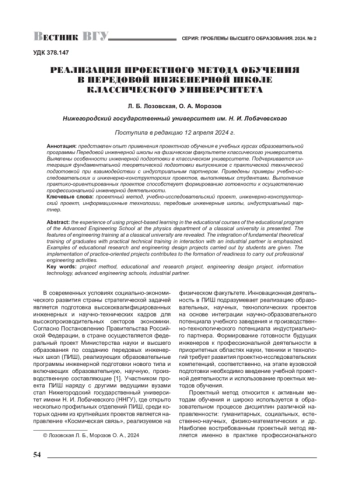Представлен опыт применения проектного обучения в учебных курсах образовательной программы Передовой инженерной школы на физическом факультете классического университета. Выявлены особенности инженерной подготовки в классическом университете. Подчеркивается интеграция фундаментальной теоретической подготовки выпускников с практической технической подготовкой при взаимодействии с индустриальным партнером. Приведены примеры учебно-исследовательских и инженерно-конструкторских проектов, выполняемых студентами. Выполнение практико-ориентированных проектов способствует формированию готовности к осуществлению профессиональной инженерной деятельности.