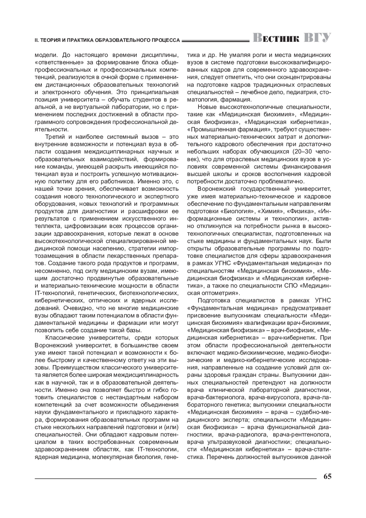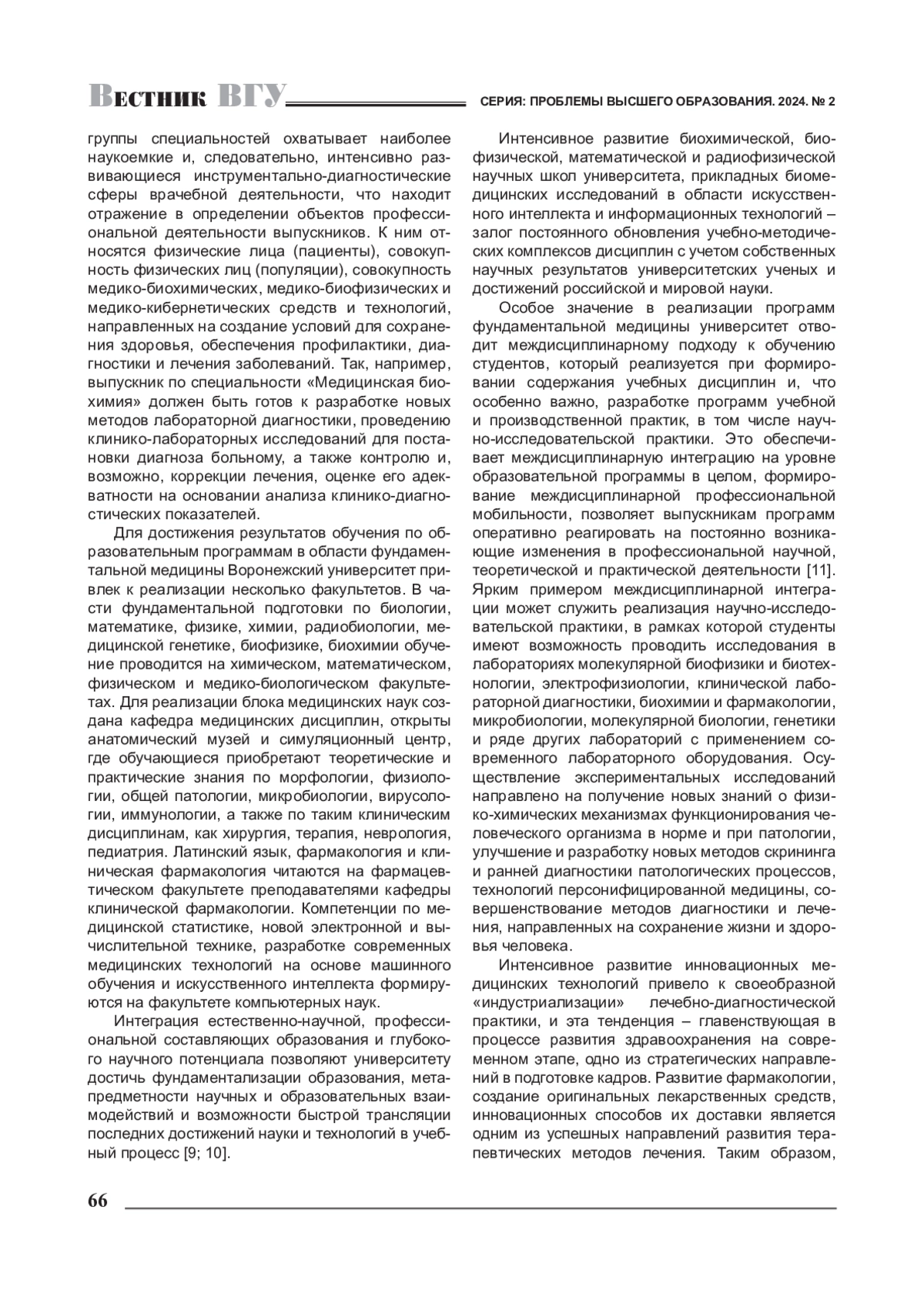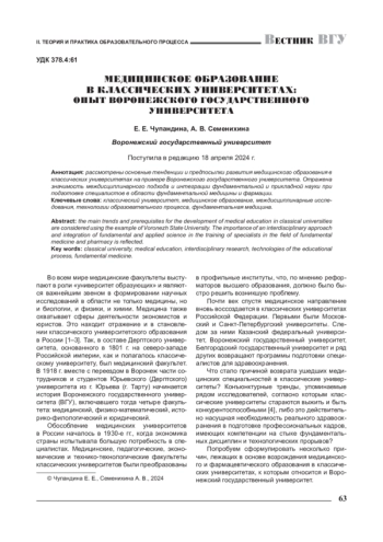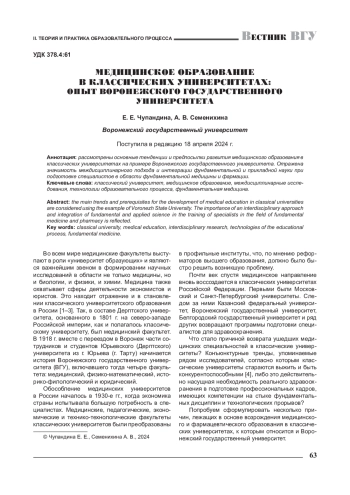 Рассмотрены основные тенденции и предпосылки развития медицинского образования в классических университетах на примере Воронежского государственного университета. Отражена значимость междисциплинарного подхода и интеграции фундаментальной и прикладной науки при подготовке специалистов в области фундаментальной медицины и фармации.